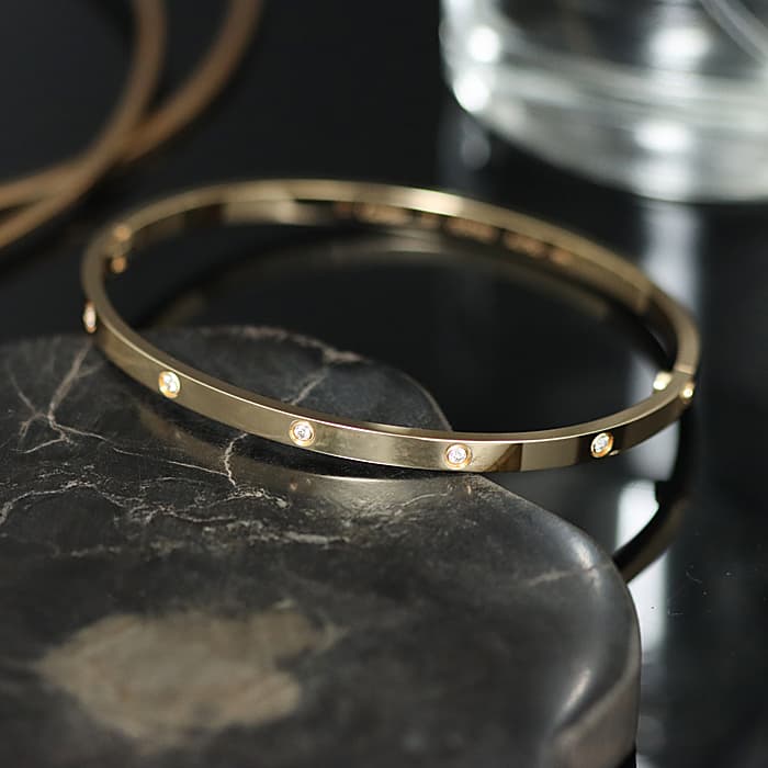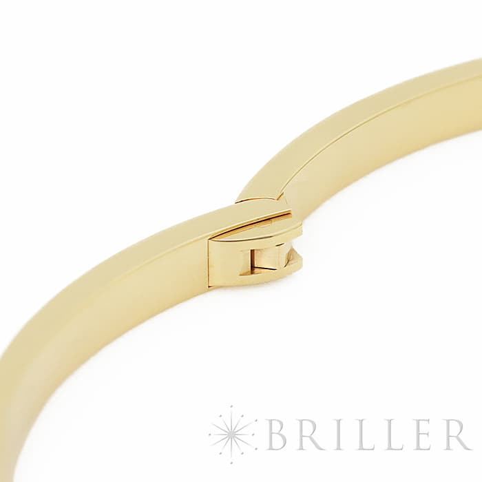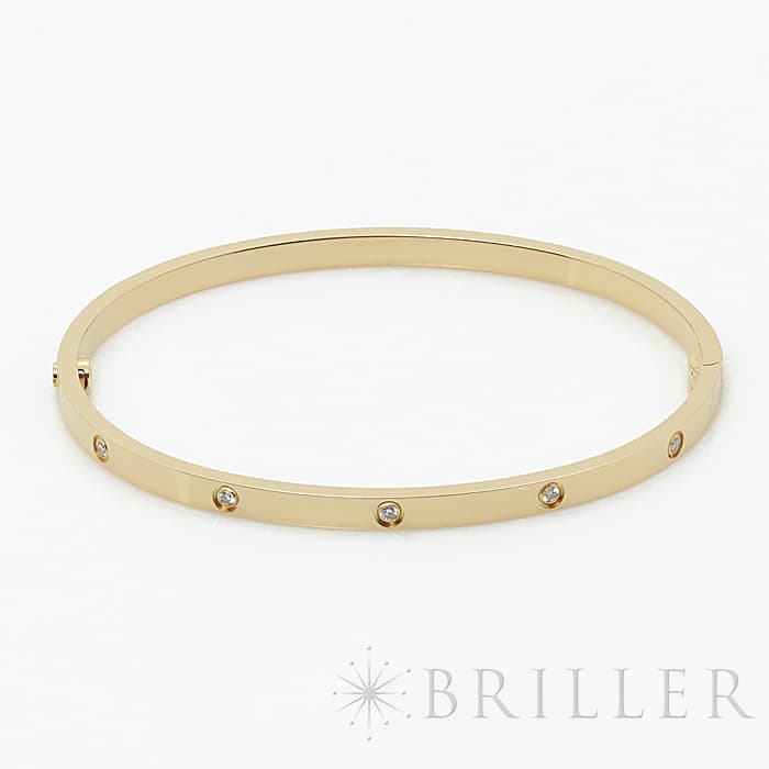 世界5大ジュエラーのひとつである「カルティエ」。1970年代にニューヨークで生まれたLOVE コレクションは、愛の絆を象徴するビスモチーフが特徴のコレクションです。こちらは華やかなイエローゴールド素材にビスの代わりとしてブリリアントカットの贅沢なダイヤモンドを配置。細身のため、単体でも重ね付けをしても美しく収まります。バングル型のシンプルなデザインのため、コーディネートに合わせやすくおすすめのです。