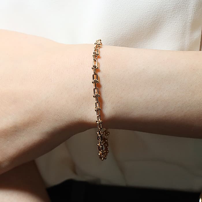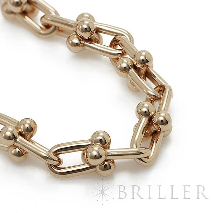 世界5大ジュエラーの1つであるティファニーは、鮮やかなティファニーブルーと呼ばれるブランドカラーで、ジュエリー好きでなくても知らない人がいないほどの知名度を誇るアメリカのブランドです。 ブランド発祥の地であるニューヨークの力強さと今の時代を生き抜く女性をイメージしたハードウェアは、2017年の誕生以来大人気のコレクションです。こちらは手首回りが中間のミディアムサイズで、内径16cmとなります。