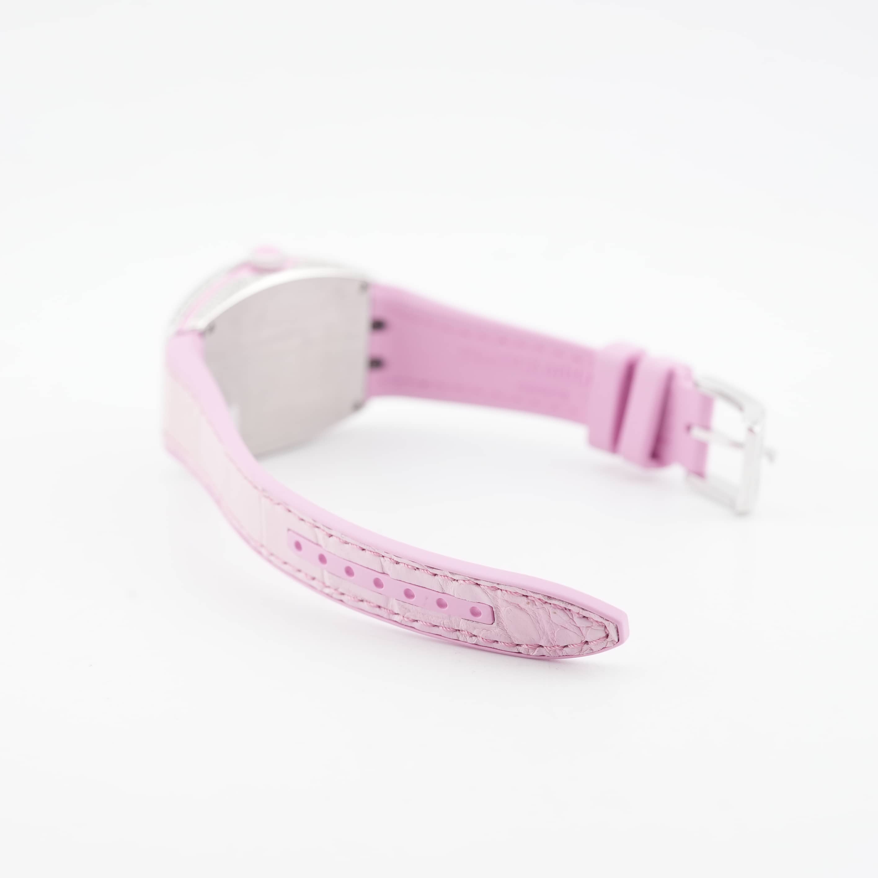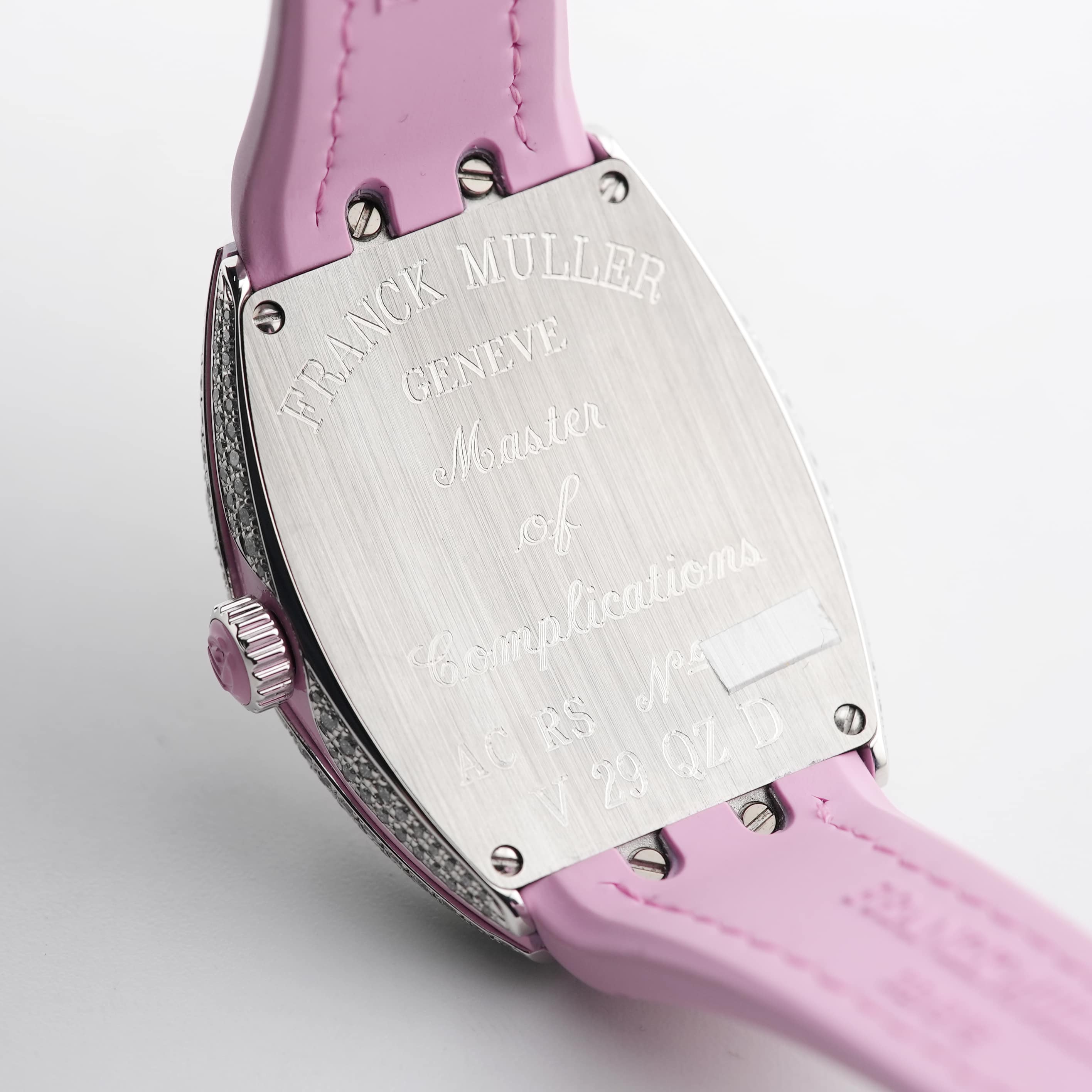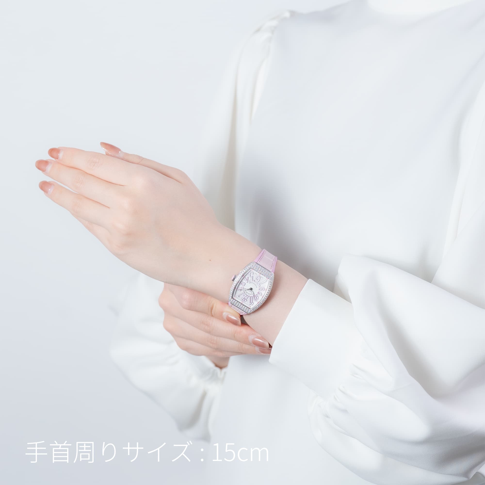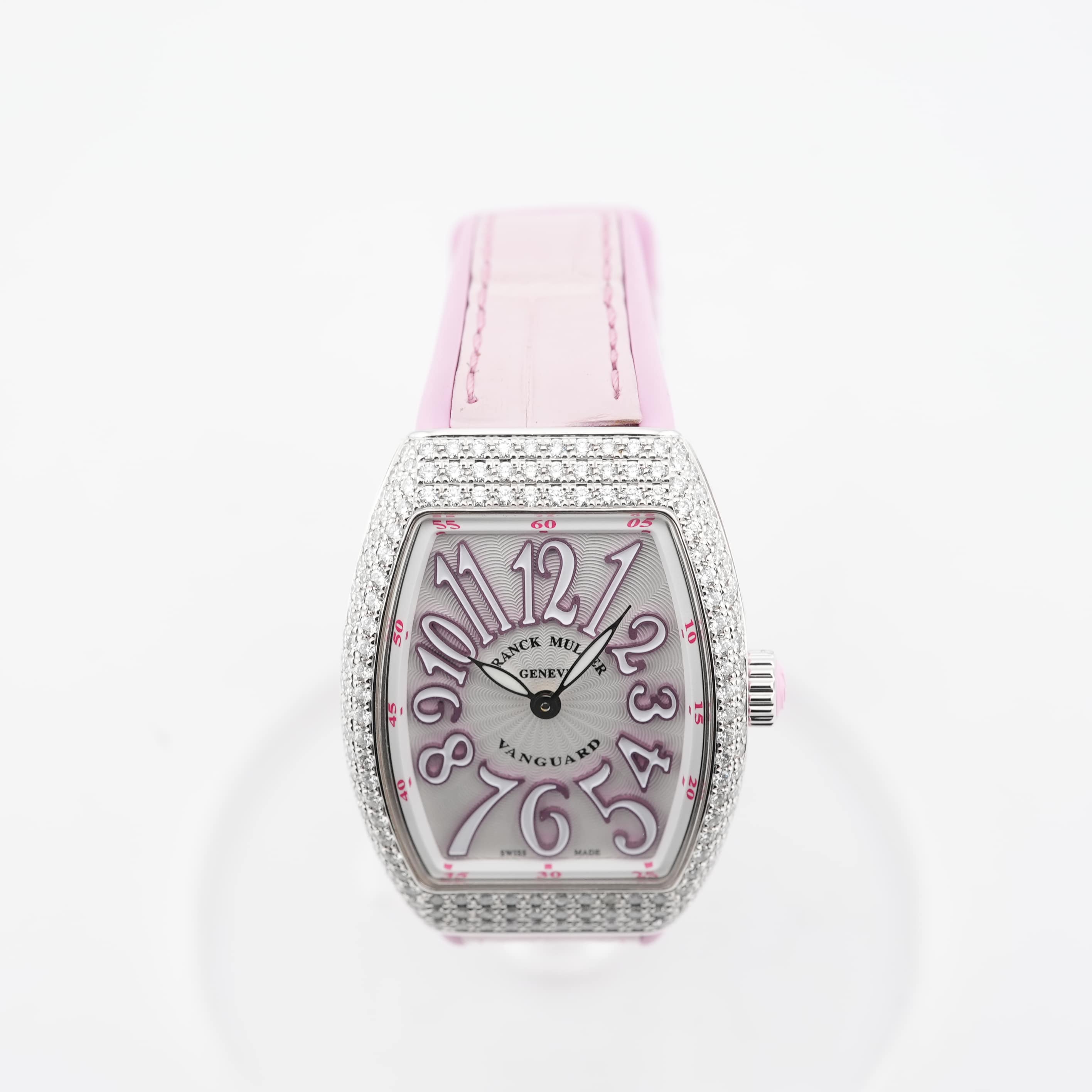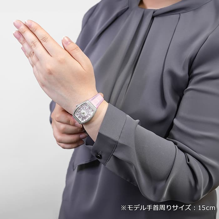 フランクミュラー ヴァンガード V29 QZ シルバーピンク ダイヤモンド FRANCK MULLER 人気のヴァンガードコレクションの中にラインナップされているレディースモデル、ケースの裏ブタ側にベルトのアタッチメントが埋め込まれ、メンズモデルとは異なり、フランクミュラーを象徴するビザン数字インデックスを採用。ダイヤルにギョウシェ彫りが施され、浮き出たインデックスとともに立体感のあるデザインに仕上がっています。ピンクカラーインデックスに合わせたピンクストラップ、ケースにダイヤモンドが敷き詰められたラグジュアリーモデルです。 【アウトレット】 純正BOXが付属しますが、モデルの異なる箱が付属します。 保証書が欠品しているため、アウトレット価格となっております。 フランク・ミュラー 時計の買取り・下取りも行っておりますので、お気軽にご相談ください。