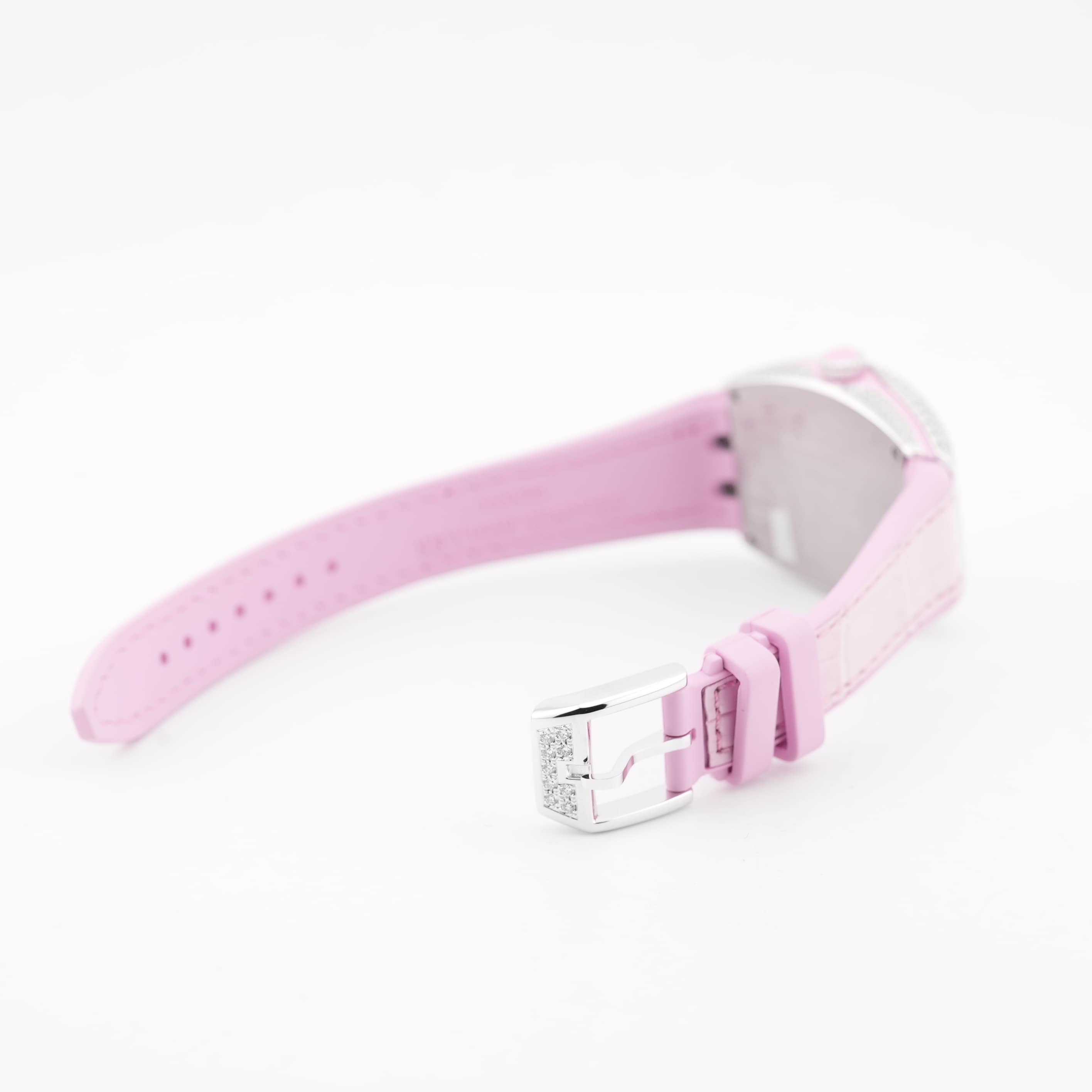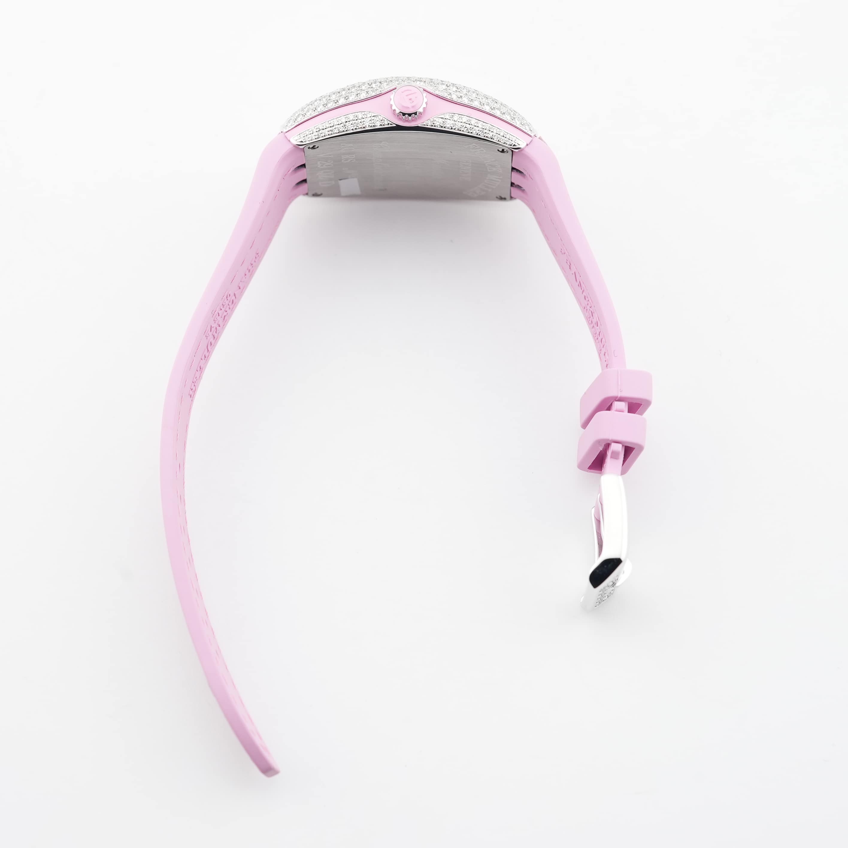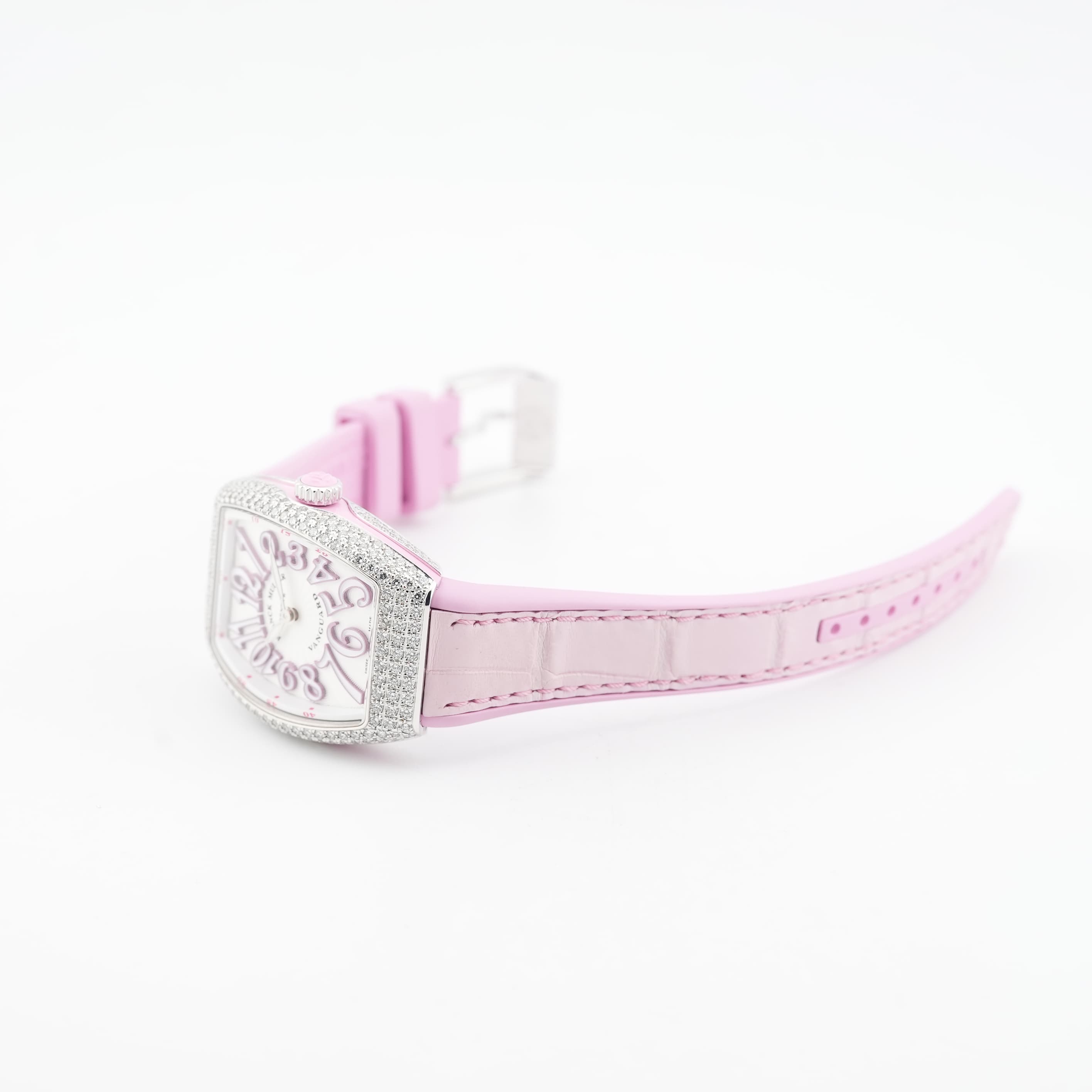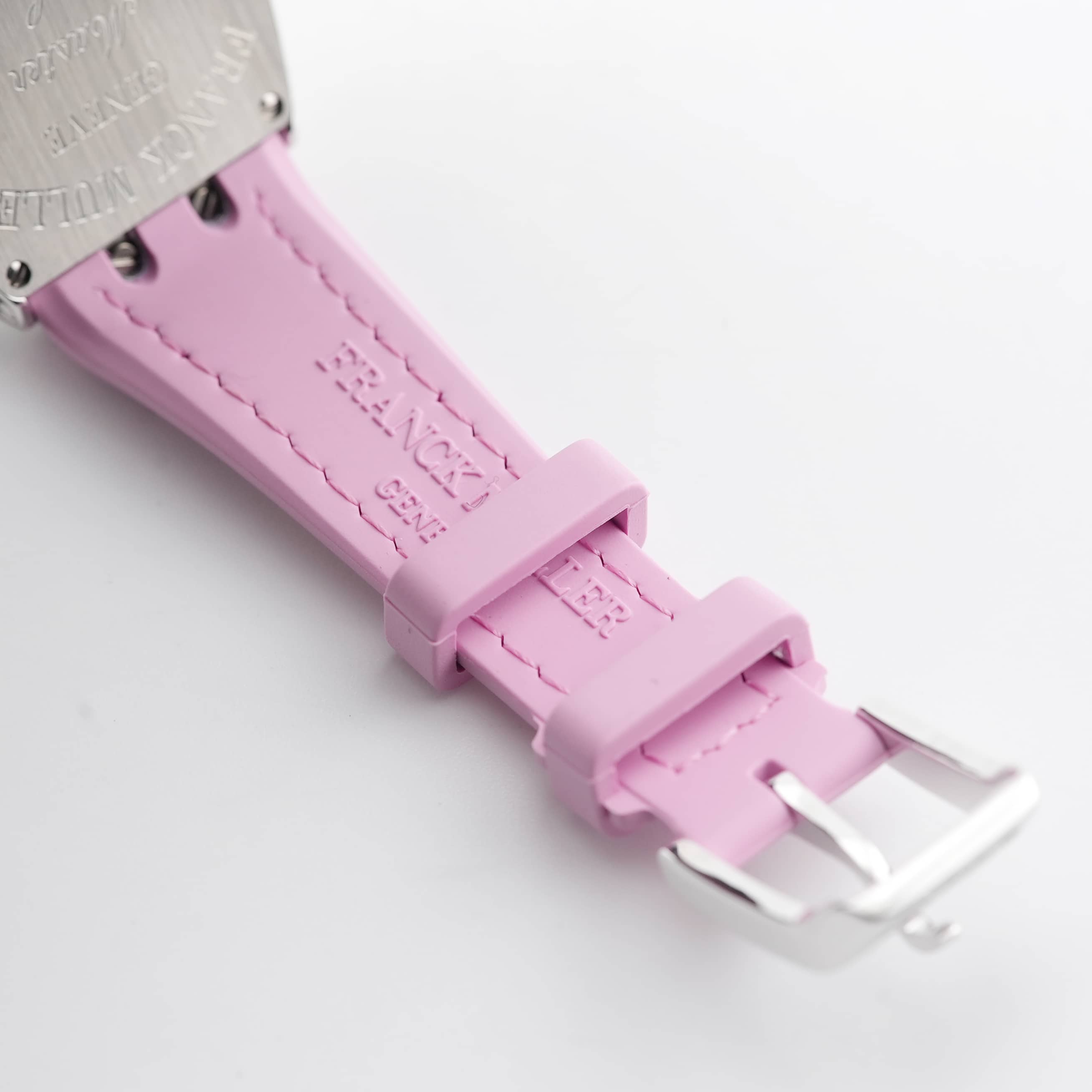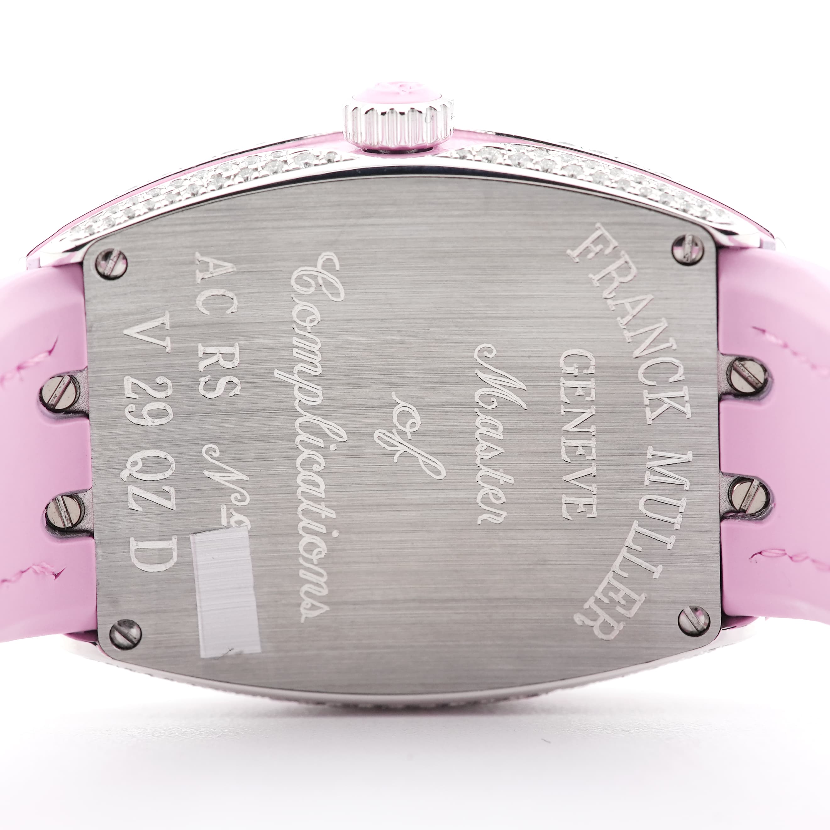 フランクミュラー ヴァンガード V29 QZ シルバーピンク ダイヤモンド FRANCK MULLER 人気のヴァンガードコレクションの中にラインナップされているレディースモデル、ケースの裏ブタ側にベルトのアタッチメントが埋め込まれ、メンズモデルとは異なり、フランクミュラーを象徴するビザン数字インデックスを採用。ダイヤルにギョウシェ彫りが施され、浮き出たインデックスとともに立体感のあるデザインに仕上がっています。ピンクカラーインデックスに合わせたピンクストラップ、ケースにダイヤモンドが敷き詰められたラグジュアリーモデルです。 【アウトレット】 純正BOXが付属しますが、モデルの異なる箱が付属します。 保証書が欠品しているため、アウトレット価格となっております。 フランク・ミュラー 時計の買取り・下取りも行っておりますので、お気軽にご相談ください。