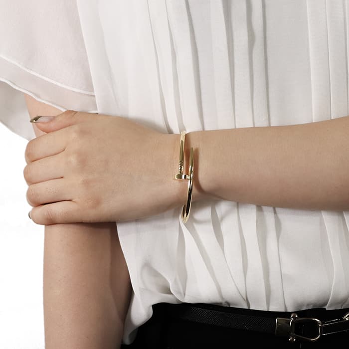 フランスで誕生し、独創的なデザインや技術力の高さから圧倒的な支持を受けるブランド「カルティエ」。絆をつなぐ、1本の釘から誕生した「ジュスト アンクル」のブレスレットは、個性的かつ上品なデザインが人気のジュエリーです。大胆かつモダンな雰囲気で、洗練された美しさを放ちます。