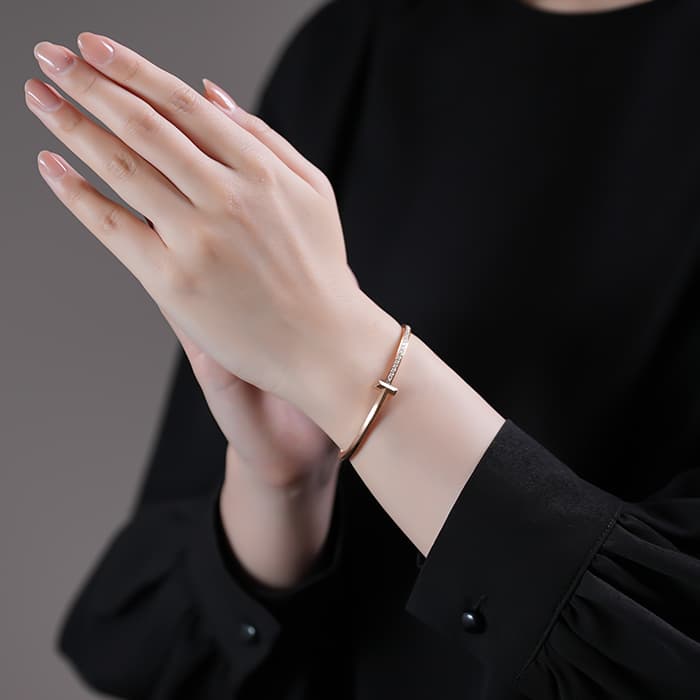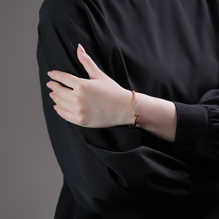 アメリカのトップジュエラー「ティファニー」を代表する「Tコレクション」。メゾンの頭文字である「T」のモチーフを取り入れた、モダンかつ完成されたデザインで大変人気です。ブレスレットの半分にダイヤモンドがあしらわれ、リッチな輝きと都会的な洗練された雰囲気に仕上がっています。バングルの太さが程よく、1本でも手元に視線を集めるほどの存在感を放ちます。着脱のしやすい点も魅力で、シンプルなスタイルのスパイスとしても、パーティーなどのスタイルに華を添えるアイテムとしても活躍するジュエリーです。