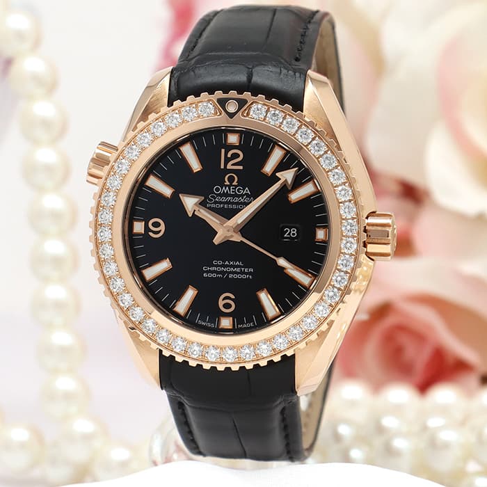 オメガを代表するダイバーズウォッチ「シーマスター プラネットオーシャン」 600mの防水にヘリウムエスケープバルブ、逆回転防止ベゼルを備えた 機能性の高い本格派のダイバーズウォッチです。 ベゼルにはダイヤモンドをセッティングしたスポーティーでエレガントな1本。 このモデルの中核を成すコーアクシャル キャリバー8521は、 シースルーのケースバックから眺めることができます。