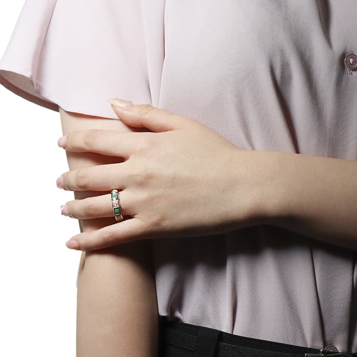 シンプルな構成ながらもマラカイトとダイヤモンドが交互に輝く存在感のある指輪です。