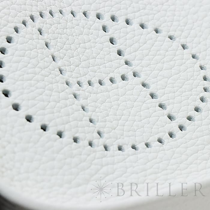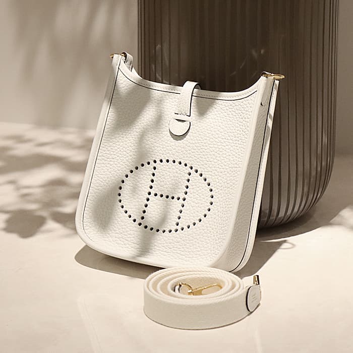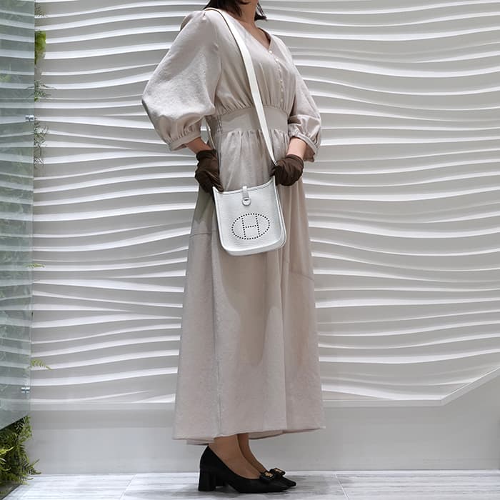 馬の蹄鉄をイメージして作られた「エヴリン」は、カジュアルに普段使いのできる人気のショルダーバッグです。 前面にエルメスの頭文字「H」マークを大きくパンチングしたデザインが特徴で、一目でエルメスのバッグと分かります。TPMはコンパクトなサイズ感ですが、お出かけの必需アイテムであるミニ財布やキーケース、コンパクトなど難なく収納することができます。肩掛けにも斜め掛けにもでき、その日の気分やファッションに合わせて変えることができます。2023SSのニューカラー「ニューホワイト」はよりクリーンな白さが際立ち、他のホワイトカラーのバッグよりも、より上品な印象です。オールホワイトコーデはもちろん、カラフルなツイリーやチャームを付けて自分好みのバッグに変身させるのも、大変おすすめです。