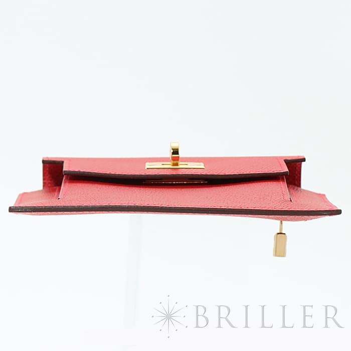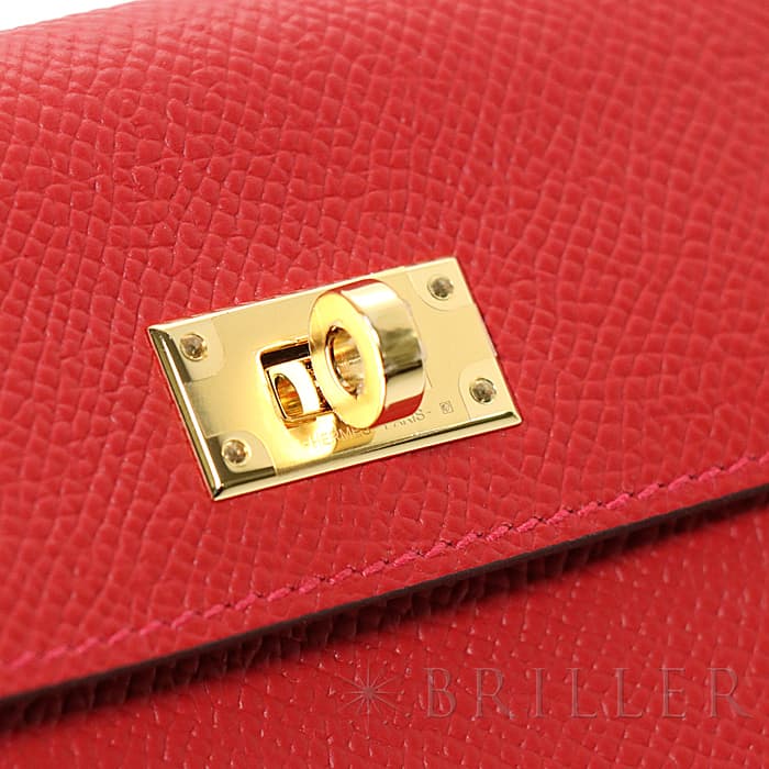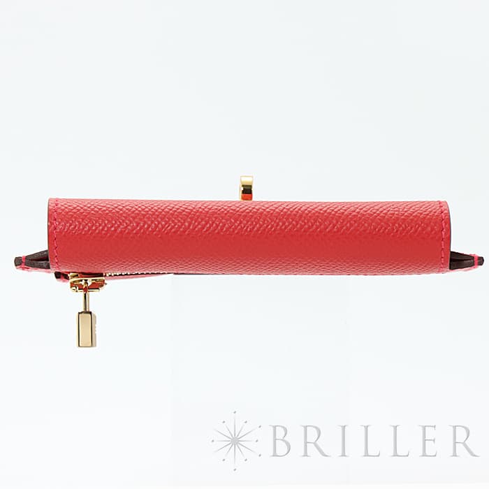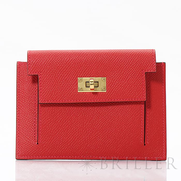 ケリーの金具が特徴的なコンパクト財布「ケリーポケット」裏には特徴的な可愛らしいカデナが付いたファスナーが付いており、表のポケットと裏のファスナーで様々な使い方が出来そうです。エプソン素材は細かな型押しで傷がつきにくく、ビビットなルージュカザックにゴールド金具はエレガントです。