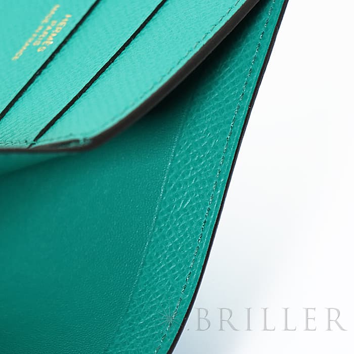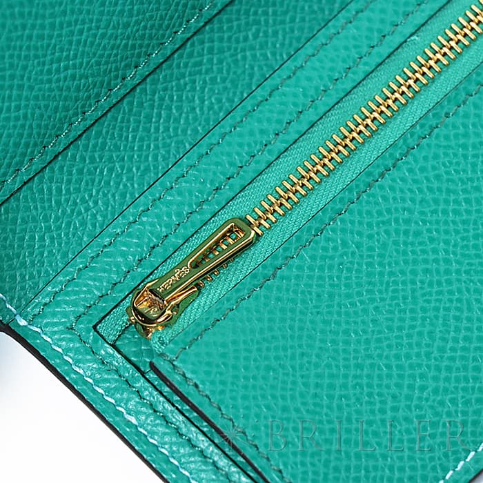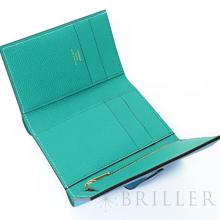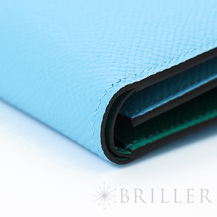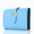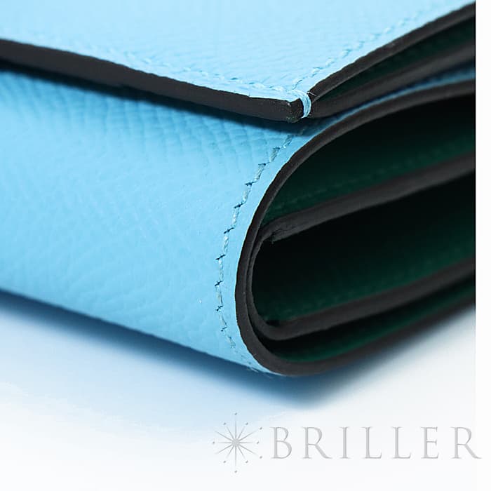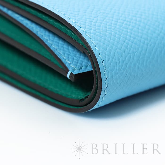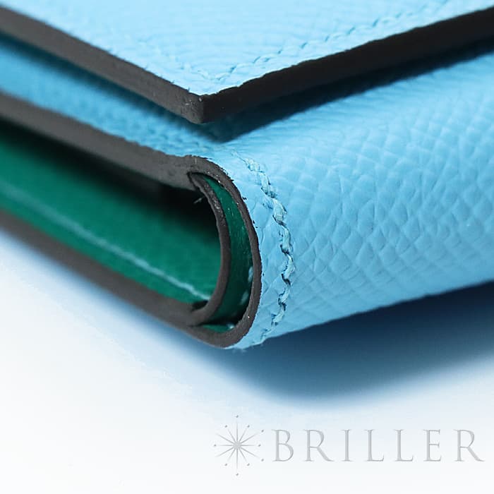 スモールレザーグッズの中でもエルメスの代名詞といえる「ベアン」シリーズ。フランス西部のベアン地方が由来です。エルメスの代表的なデザイン「Hマーク」の留め具が特徴的で、洗練されたシンプルなデザインの中に、エルメスらしい上質なラグジュアリー感を演出しています。2021年に登場したベアンコンビネはコンパクトよりさらに小さくなっています。 カードが4枚とジップ付きのコインケース、お札入れになっていて、使い勝手の良さは小さくても問題ありません。 型崩れしにくく、傷がつきにくいエプソン素材で、外側は爽やかな水色の「セレステ」を使用し内側には鮮やかなヴェールジェイドのヴェルソタイプで、大人の女性も楽しみやすい洗練された印象に仕上がっています。