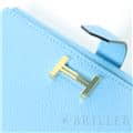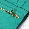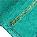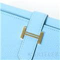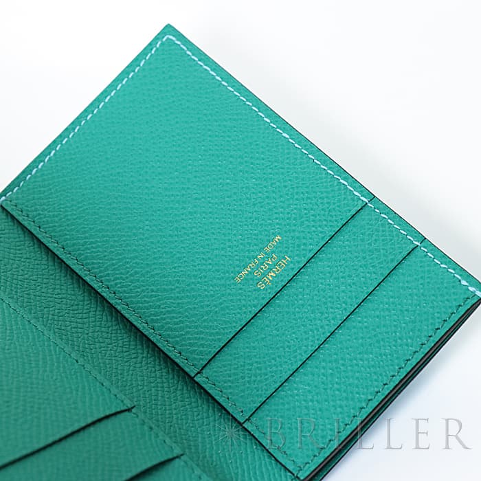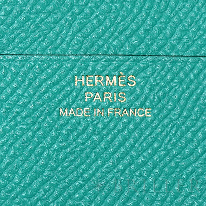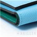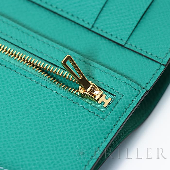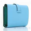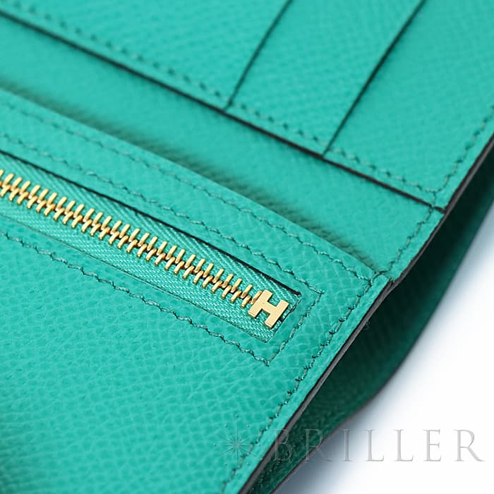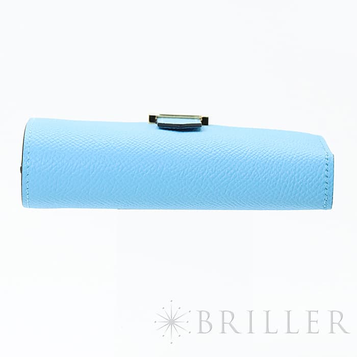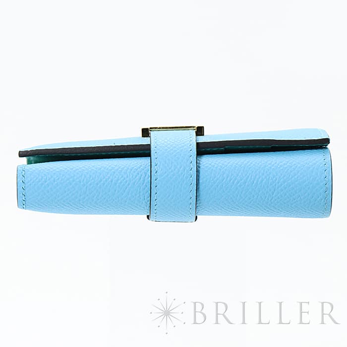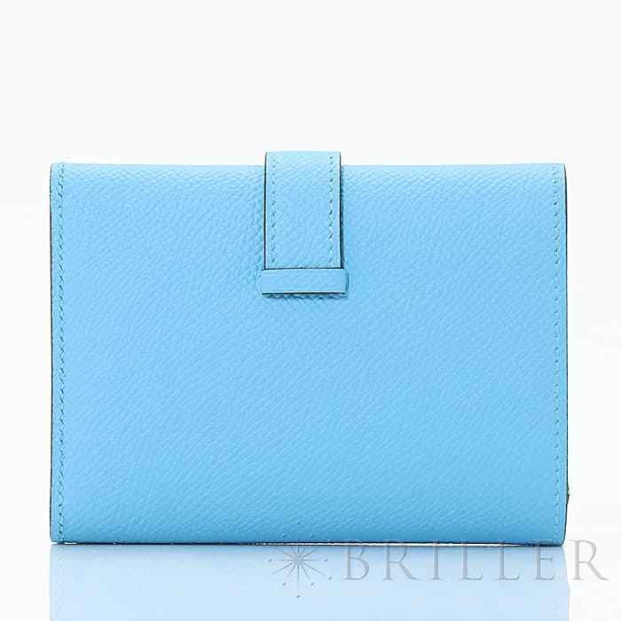 スモールレザーグッズの中でもエルメスの代名詞といえる「ベアン」シリーズ。フランス西部のベアン地方が由来です。エルメスの代表的なデザイン「Hマーク」の留め具が特徴的で、洗練されたシンプルなデザインの中に、エルメスらしい上質なラグジュアリー感を演出しています。2021年に登場したベアンコンビネはコンパクトよりさらに小さくなっています。 カードが4枚とジップ付きのコインケース、お札入れになっていて、使い勝手の良さは小さくても問題ありません。 型崩れしにくく、傷がつきにくいエプソン素材で、外側は爽やかな水色の「セレステ」を使用し内側には鮮やかなヴェールジェイドのヴェルソタイプで、大人の女性も楽しみやすい洗練された印象に仕上がっています。