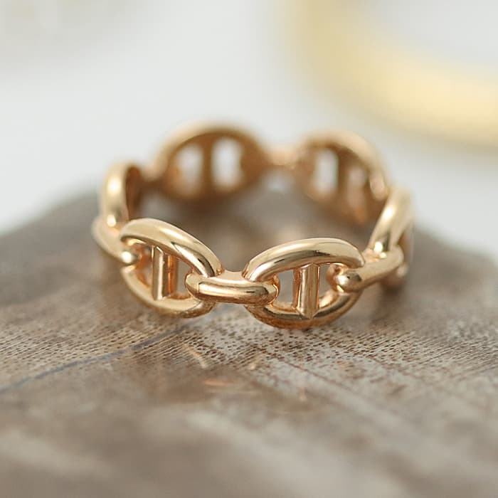 船の錨をモチーフにした、エルメスを象徴するようなデザインのシェーヌダンクル。1937年、ロベール・デュマはノルマンディの海岸を、船を眺めながら散策していた際に船を岸につなぎとめる錨の鎖が視線を捉えたことをきっかけにして、エルメスを代表する《シェーヌ・ダンクル》が誕生しました。男女兼用でお使いいただけるリングです。