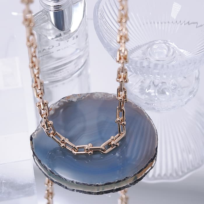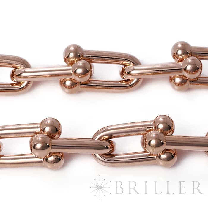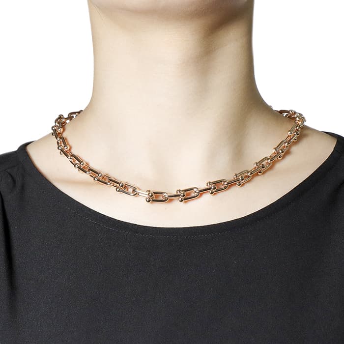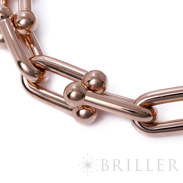 世界5大ジュエラーの1つであるティファニーは、鮮やかなティファニーブルーと呼ばれるブランドカラーで、ジュエリー好きでなくても知らない人がいないほどの知名度を誇るアメリカのブランドです。 ブランド発祥の地であるニューヨークの力強さと今の時代を生き抜く女性をイメージしたハードウェアは、2017年の誕生以来大人気のコレクションです。肌馴染みの良いローズゴールドのゲージリンクが連なった大胆なネックレスはファッションにアクセントをプラスしてくれます。