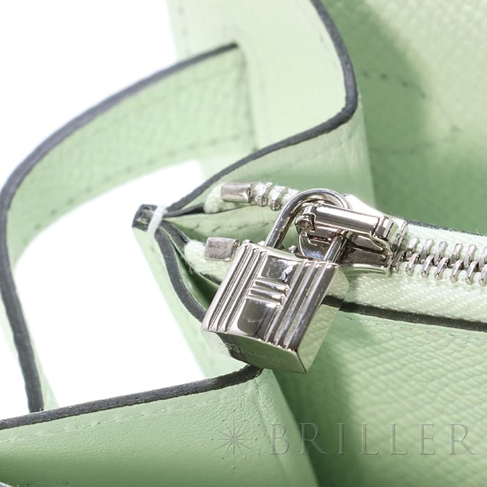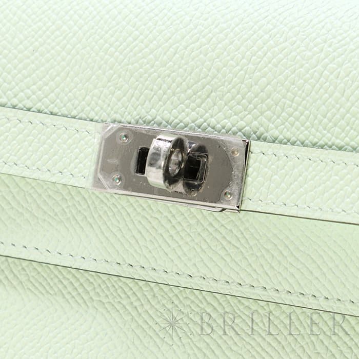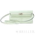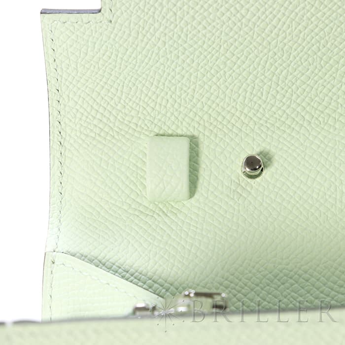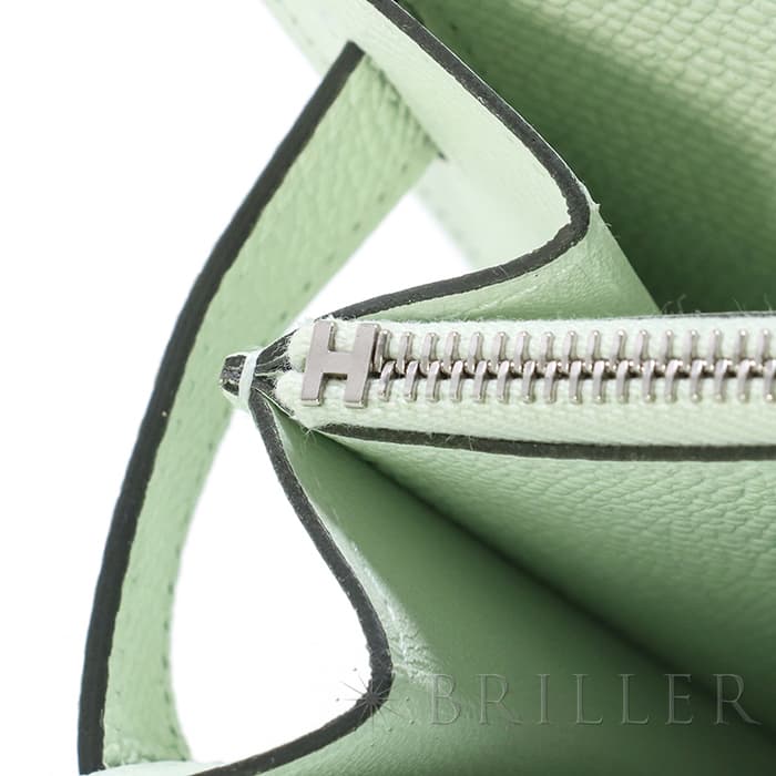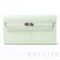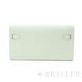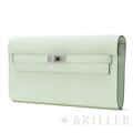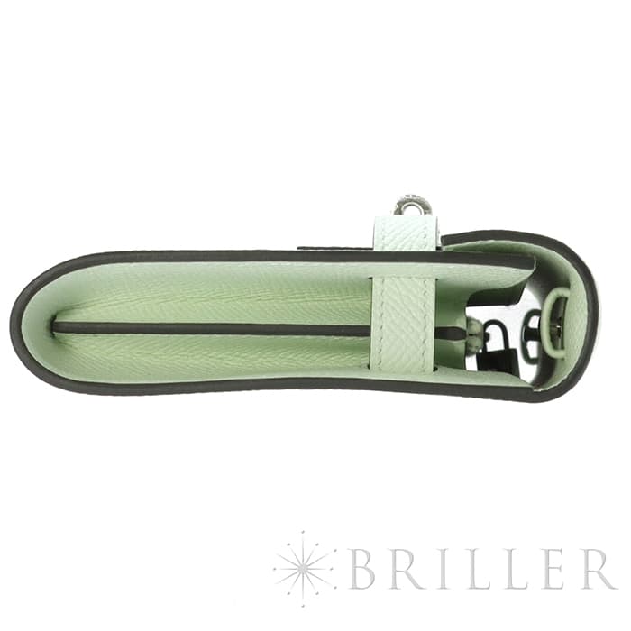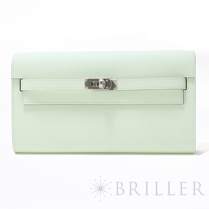 エルメス ケリー ロング トゥーゴー ヴォーエプソン ヴェールフィズ シルバー金具 ケリーのエレガントな雰囲気はそのままに、お財布として、そしてミニバッグとしても使える「ケリー ロング トゥーゴー」。ファスナー付きのポケットが中央にあり、その両側が大きく開くコンパートメントになっています。それぞれにカードポケットが2つずつあり、細かな収納に対応しています。ファスナーにカデナが付いているのもケリーならではの細かなポイントです。クラシカルにクラッチバッグとして手持ちしても、付属のストラップを取り付けてショルダーバッグとしてもお使いただけます。 型崩れしにくくキズに強い「エプソン」素材は、滑らかな触り心地と洗練された見た目が魅力です。「ヴェールフィズ」のパステル調のグリーンがとてもさわやかで、シルバー金具との組み合わせは女性らしく洗練された雰囲気を引き立ててくれます。 B刻印(2023年)の新品のお品物です。