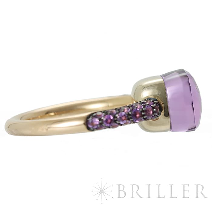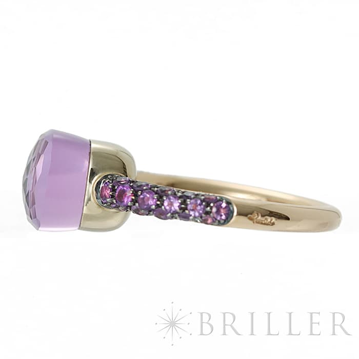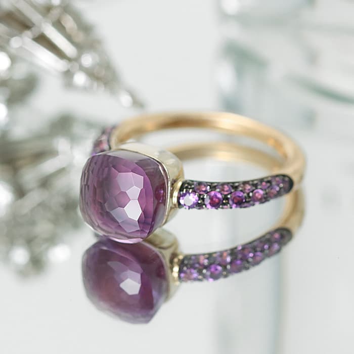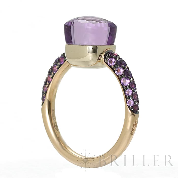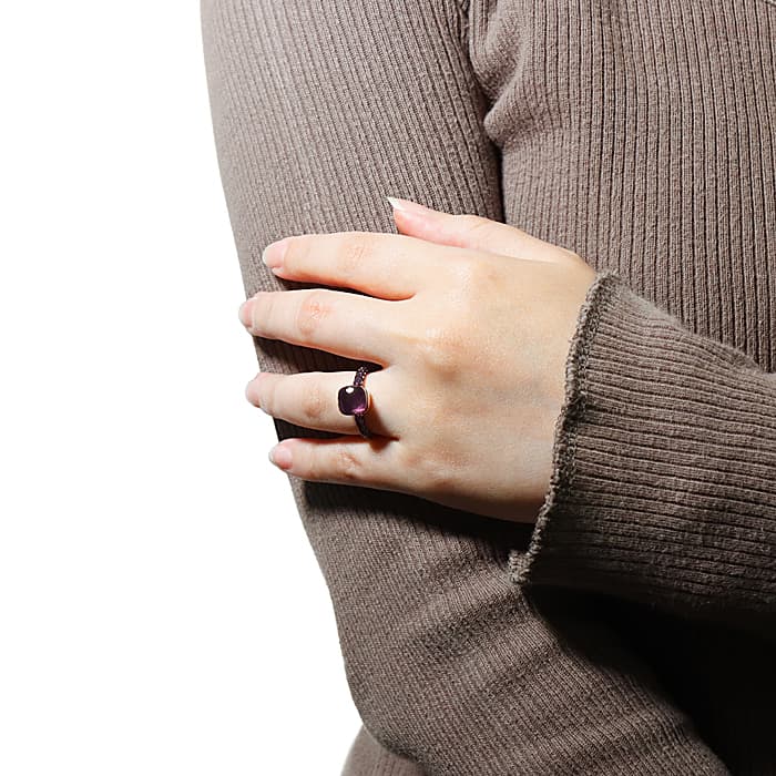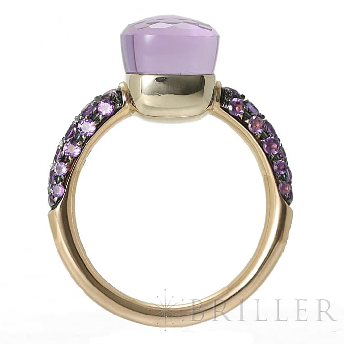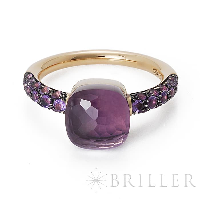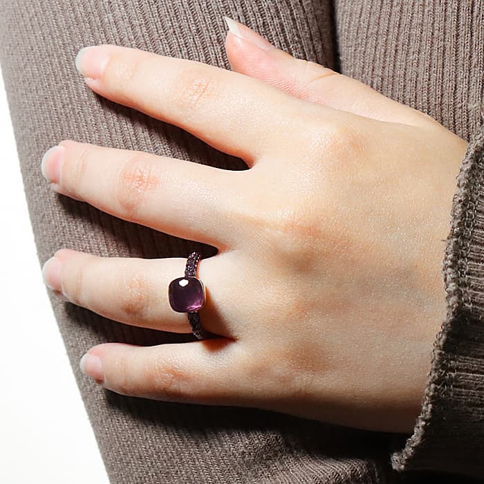 1967年にミラノで生まれたジュエリーブランド「ポメラート(POMELLATO)」。2001年に発表されたポメラートのアイコン的ジュエリー「ヌード」が入荷致しました。特許を取得している美しい多面のファセットカットとセッティングにカラフルなプレシャスストーンが大変美しいシリーズです。「ヌードリング」はぷっくりとしたストーンが存在感を持つため、単体着用で指元のアクセントとするも良し、2,3個重ね付けして存在感も出すのも良いリングです。アメジストとヒスイのメインストーンは大変華やかで、両脇に広がる32粒のアメジスト(0.4カラット)と合わさり、上品な高級感を演出しています。プレゼントにも大変おすすめなリングです。