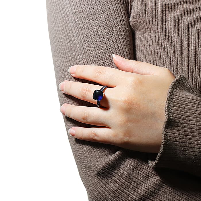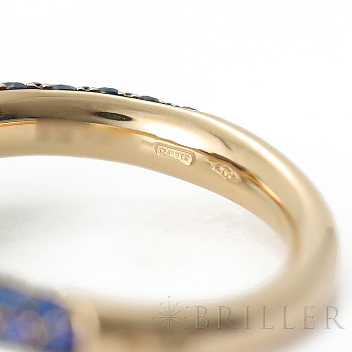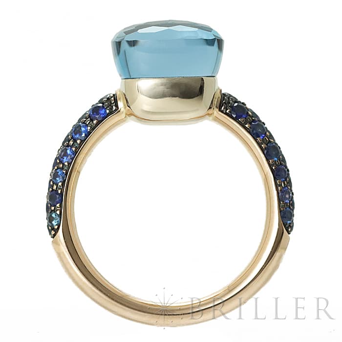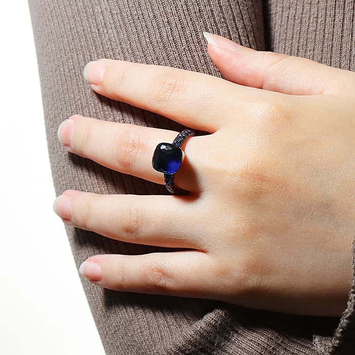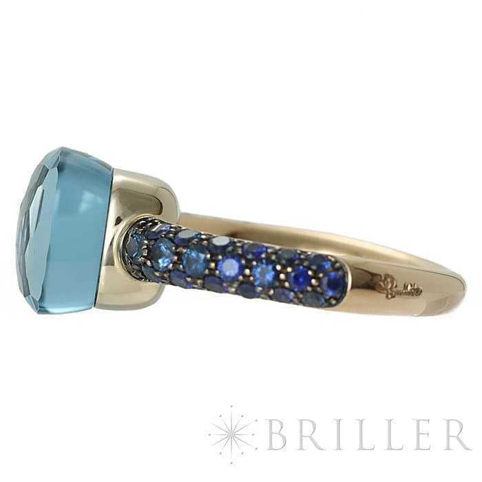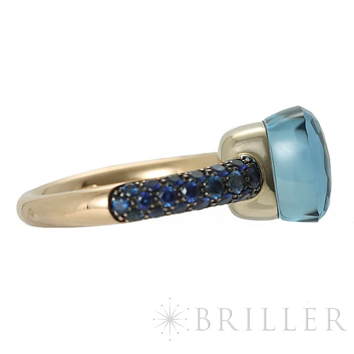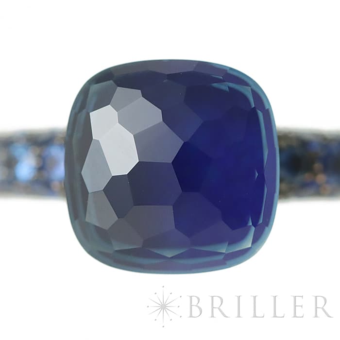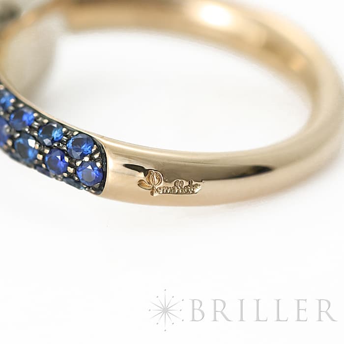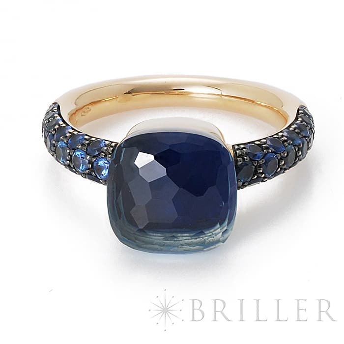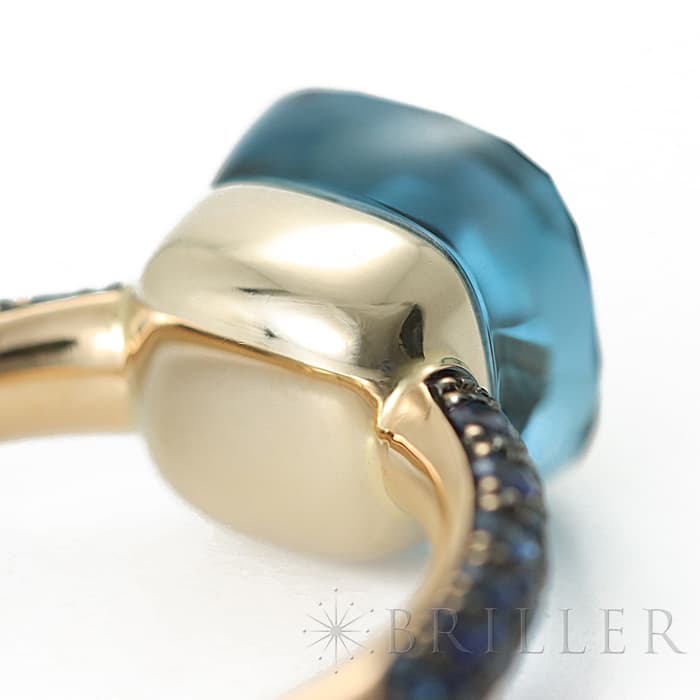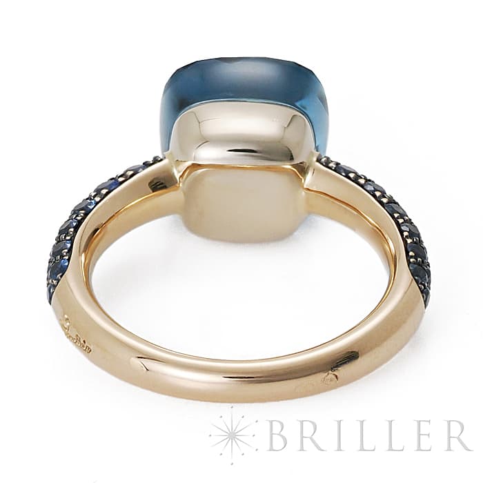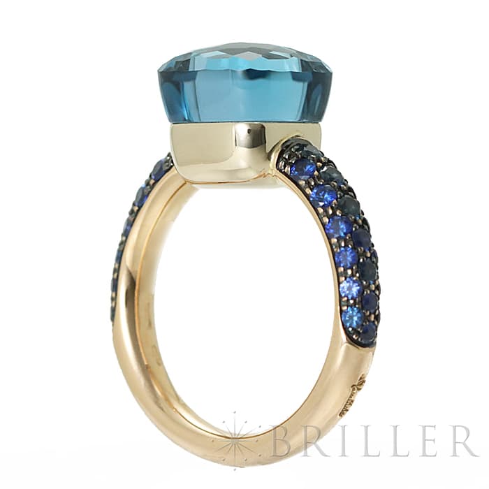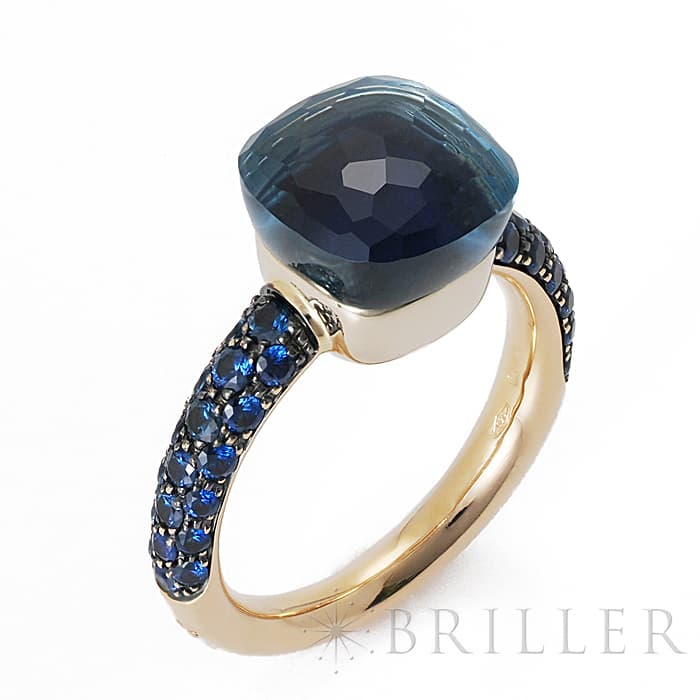 1967年にミラノで生まれたジュエリーブランド「ポメラート(POMELLATO)」。2001年に発表されたポメラートのアイコン的ジュエリー「ヌード」が入荷致しました。特許を取得している美しい多面のファセットカットとセッティングにカラフルなプレシャスストーンが大変美しいシリーズです。「ヌードリング」はぷっくりとしたストーンが存在感を持つため、単体着用で指元のアクセントとするも良し、2,3個重ね付けして存在感も出すのも良いリングです。ロンドンブルートパーズとラピスラズリのメインストーンは大変華やかで、両脇に広がる38粒のブルーサファイア(0.9カラット)と合わさり、上品な高級感を演出しています。プレゼントにも大変おすすめなリングです。