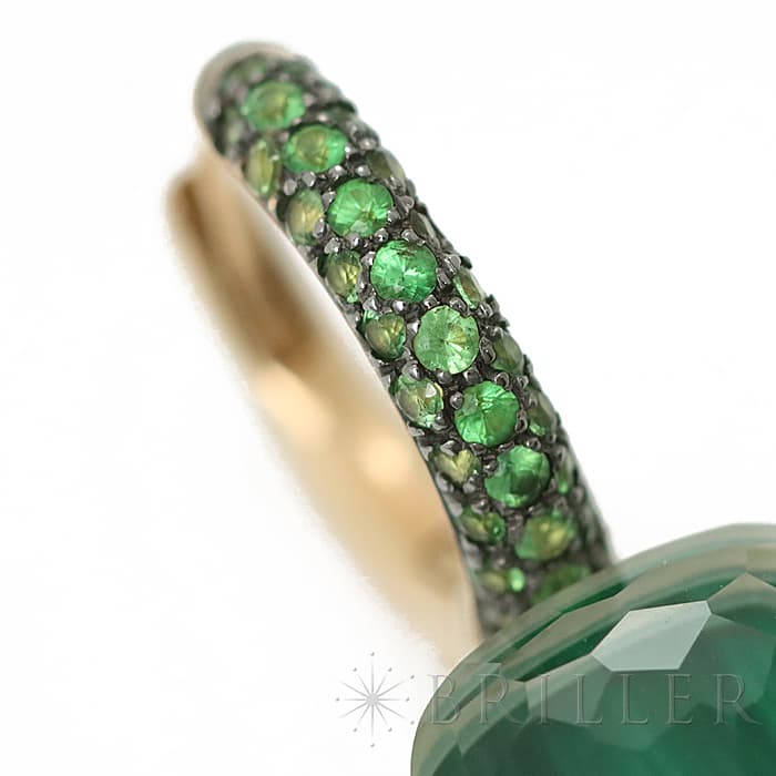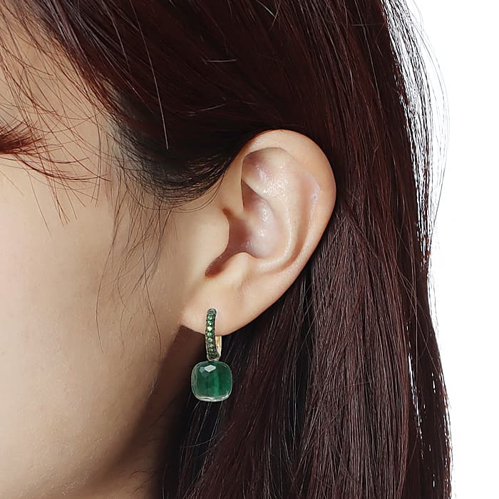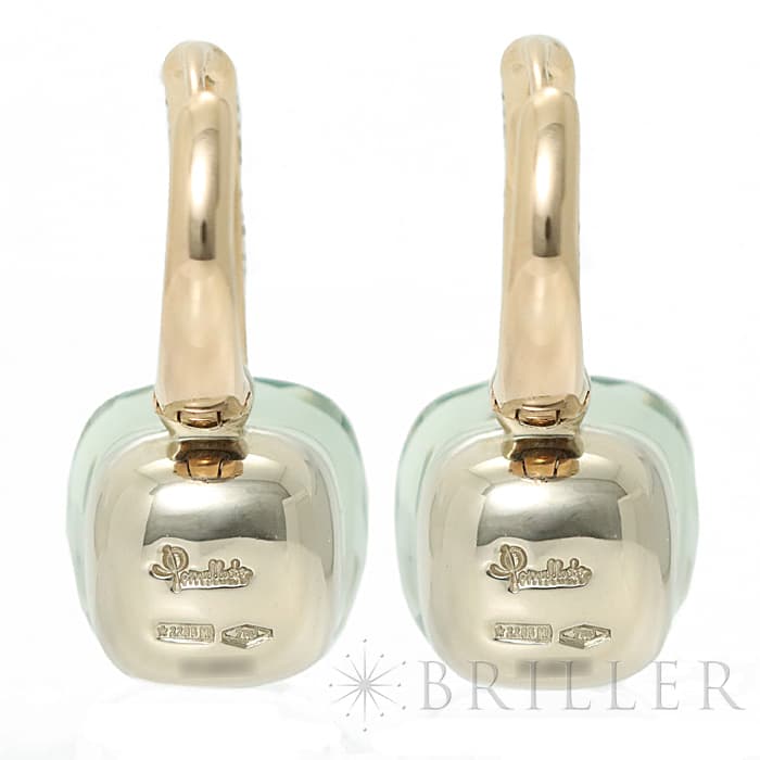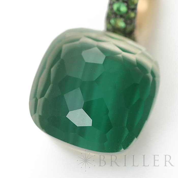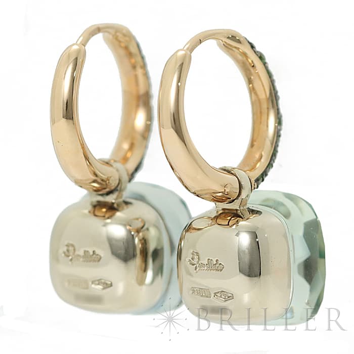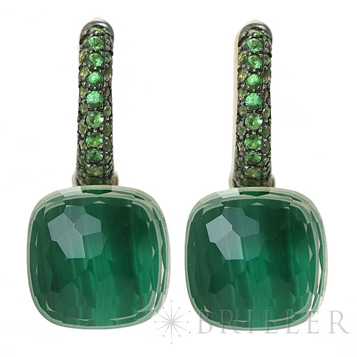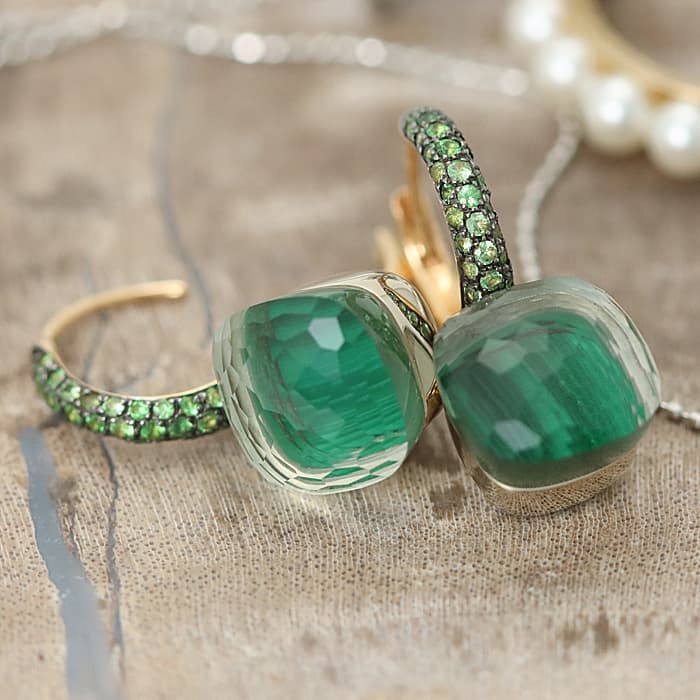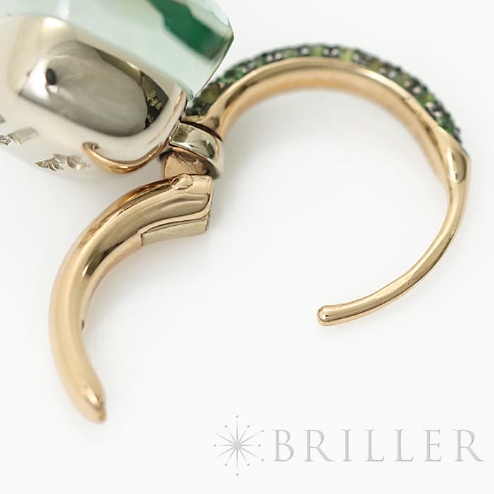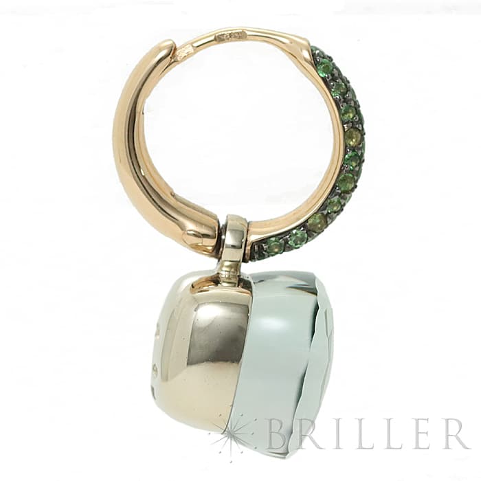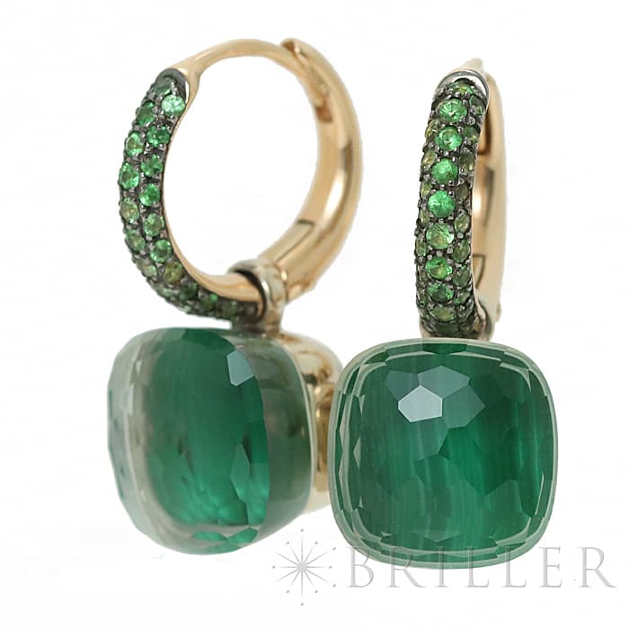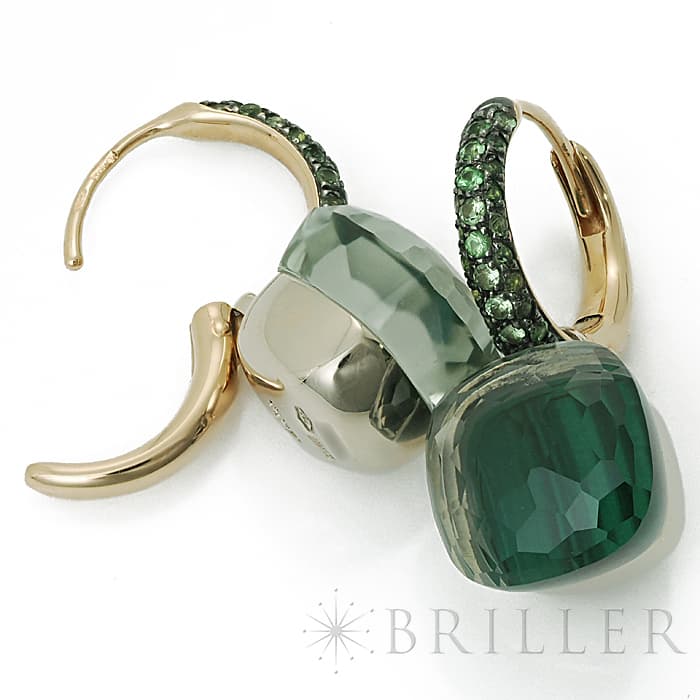 1967年にミラノで生まれたジュエリーブランド「ポメラート(POMELLATO)」。 2001年に発表されポメラートのアイコン的ジュエリー「ヌード」が入荷致しました。 カラフルなプレシャスストーンは特許を取得している多面のファセットカットとセッティングが施されており、大変美しいシリーズです。メインストーンにプラシオライトとマラカイトを使用し、ツァボライトのパヴェが合わさった鮮やかなピアスです。