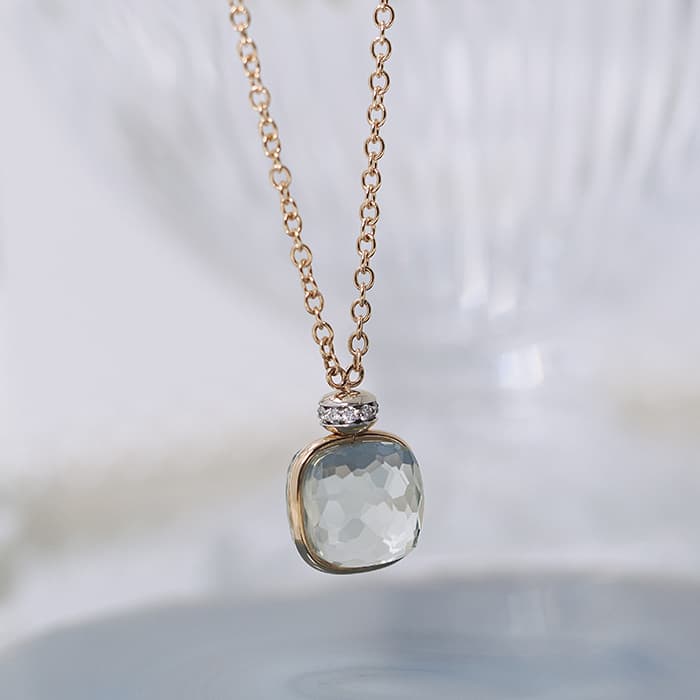 1967年にミラノで生まれたジュエリーブランド「ポメラート(POMELLATO)」。 2001年に発表されたポメラートのアイコン的ジュエリー「ヌード」が入荷致しました。 特許を取得している美しい多面のファセットカットとセッティングにカラフルなプレシャスストーンが大変美しいシリーズです。 こちらのネックレスは中央をゴールドで囲んでいるデザインとなり、ペンダントトップの「プラシオライト」はグリーンアメジストとしても知られるジェムストーンで、スモーキーな淡いモスグリーンカラーが大人の雰囲気を漂わせます。