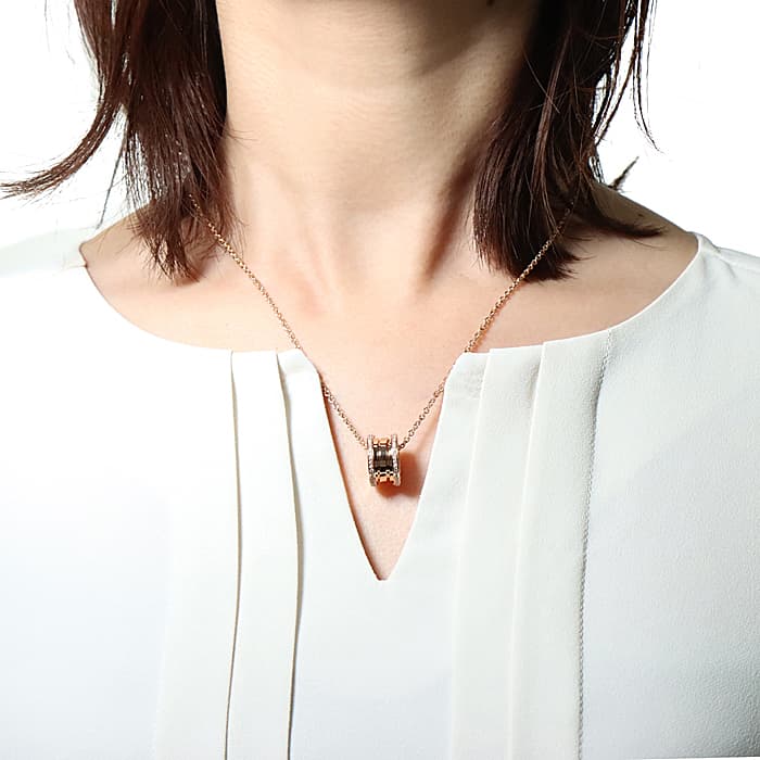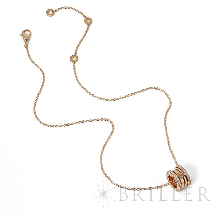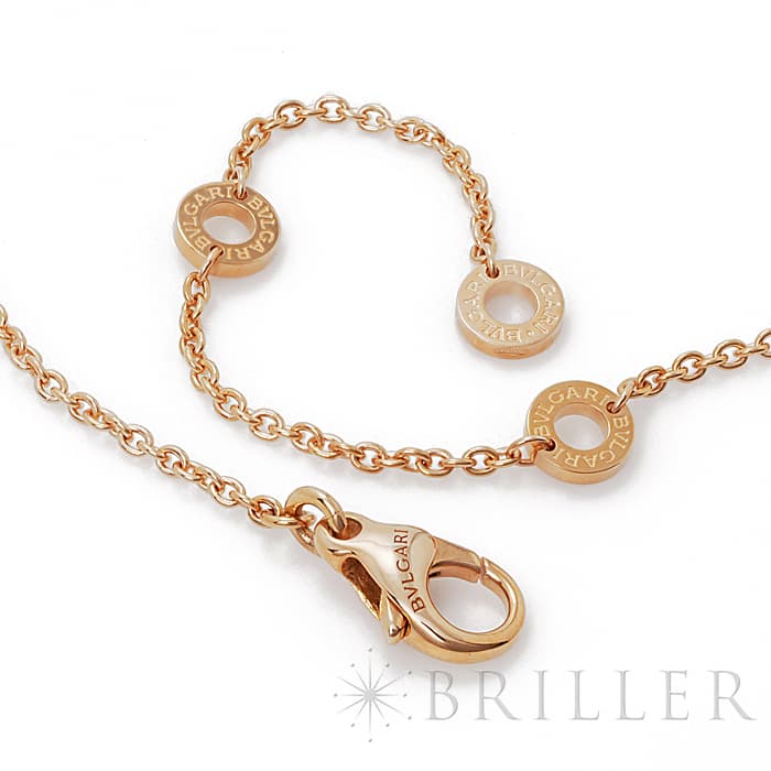 ブルガリの代表コレクション「ビー・ゼロワン」。イタリア・ローマのコロッセオからインスピレーションを受けデザインされた「ビー・ゼロワン」は、1999年に誕生して以来、ブランドのアイコンとして愛され続けています。ペンダントに刻まれた「BVLGARI」のロゴが印象的です。18Kピンクゴールド製のモチーフに、パヴェダイヤをあしらった高級感あふれるネックレスです。