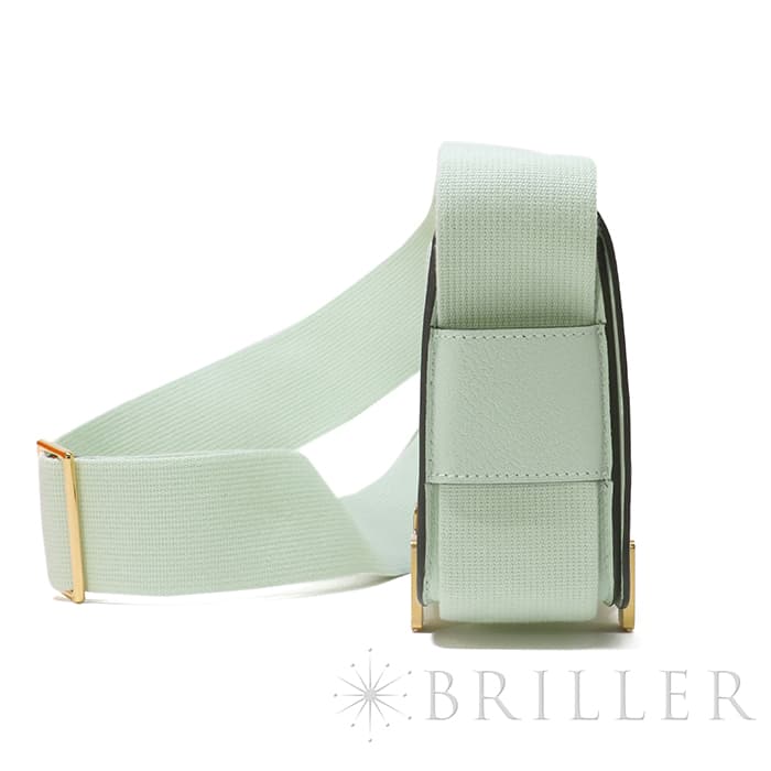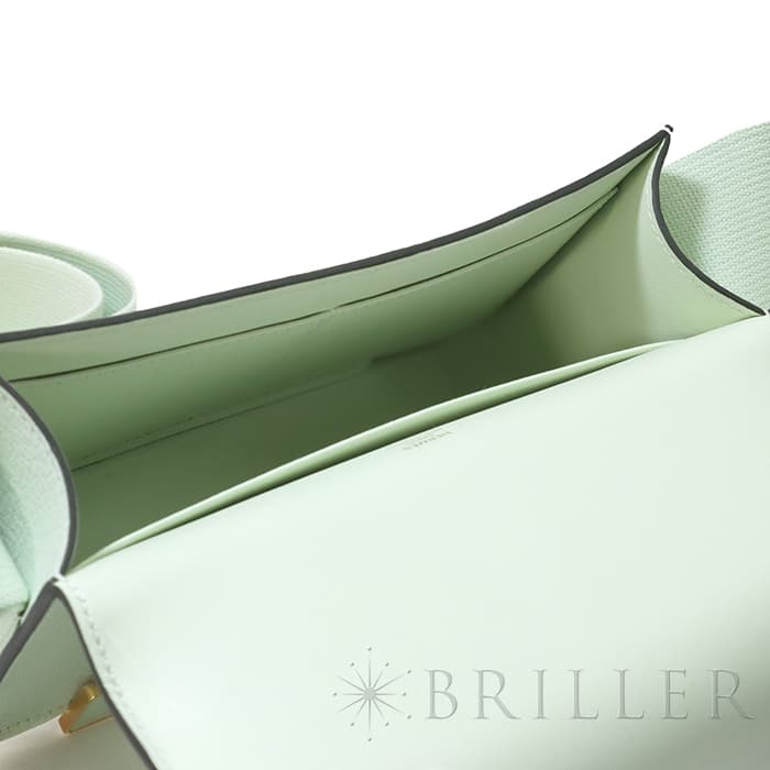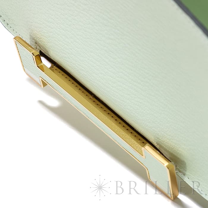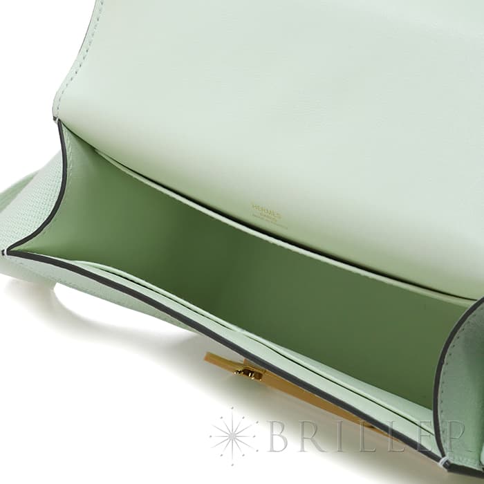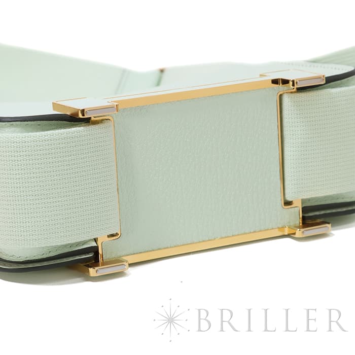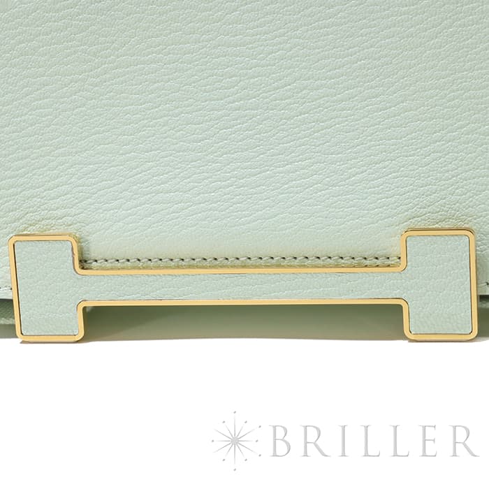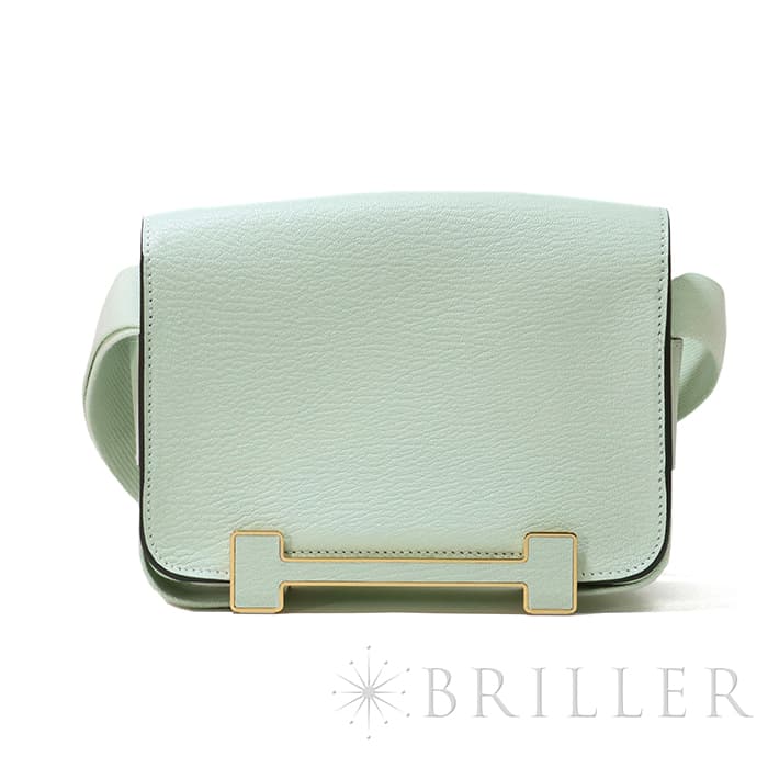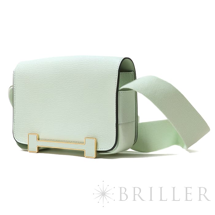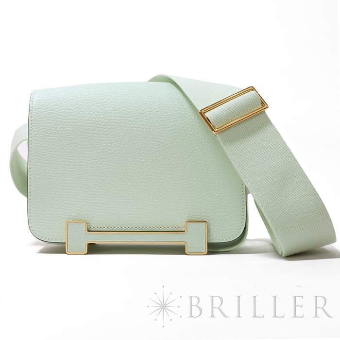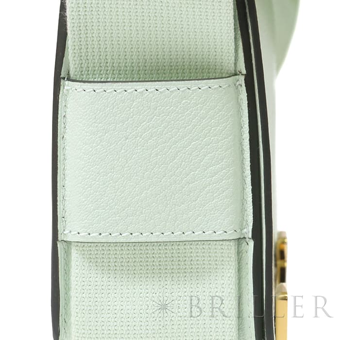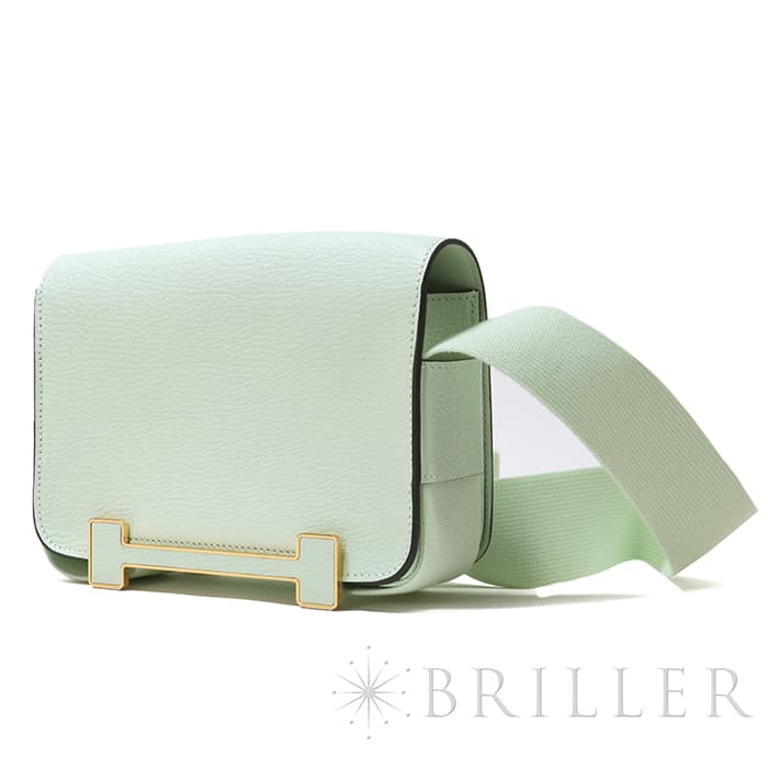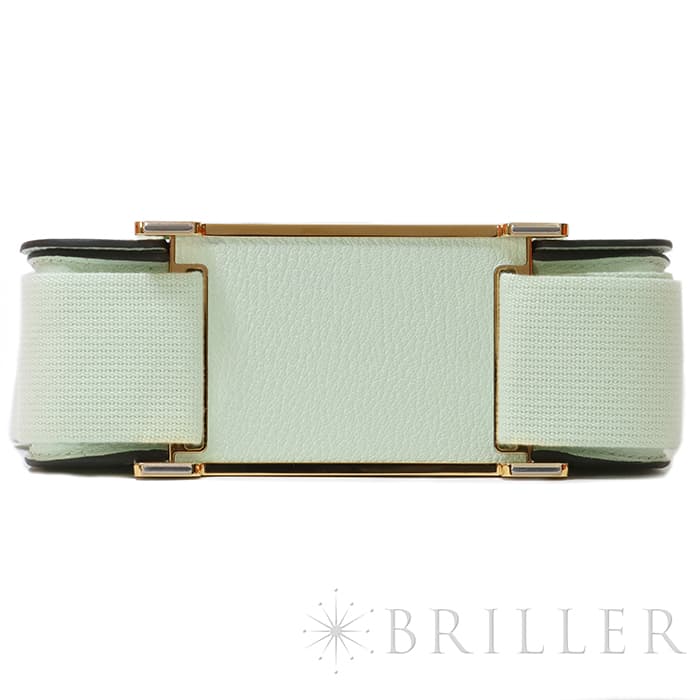 エルメス ゲタ シェーブル ヴェールフィズ ゴールド金具 HERMES 2021年の秋冬コレクションで発表されたエルメスの新作「ゲタ」。日本の下駄からインスピレーションを得て、デザインされたショルダーバッグです。エルメスの頭文字「H」マークの金具がバッグの留め具部分に使用され、さりげなくエルメスらしさを感じるデザインが魅力的です。ころんと丸みを帯びたフォルムが可愛いショルダーバッグで、装いにキュートなアクセントをプラスしてくれるこのサイズは、ショルダーの長さが調節可能なためを1連にして斜め掛けにもでき、2連にして小脇に抱えることも出来る2WAYでお楽しみ頂けます。素材は軽量感に優れ、キズに強く表面の細かい凹凸が美しいのが特徴のヤギ革のシェーブルを使用し、カラーはヴェールフィズでパステル調のグリーンがとてもさわやかで洗練された雰囲気を引き立てています。 B刻印(2023年)、箱に若干のへこみがありますが、その分お求めやすい価格となっております。
