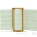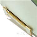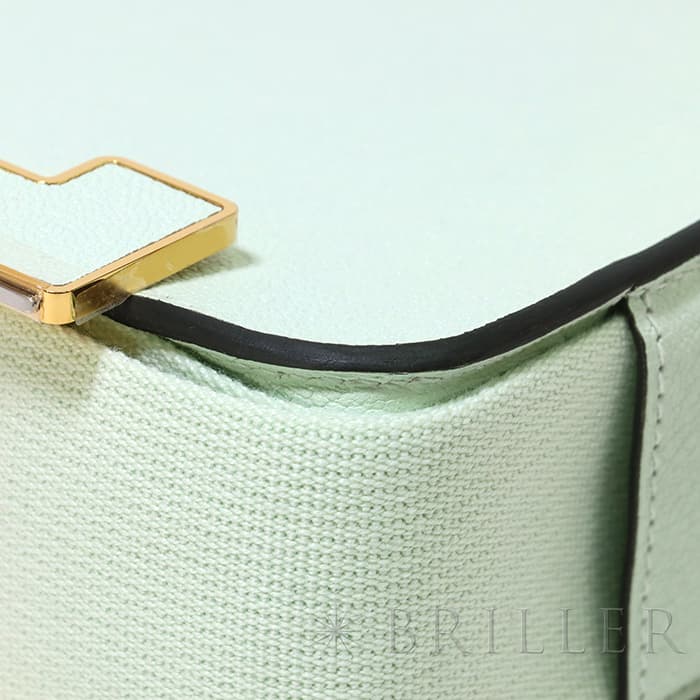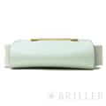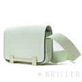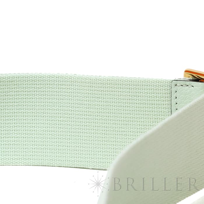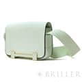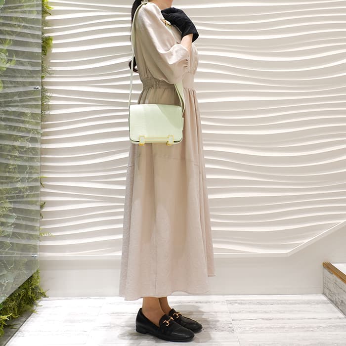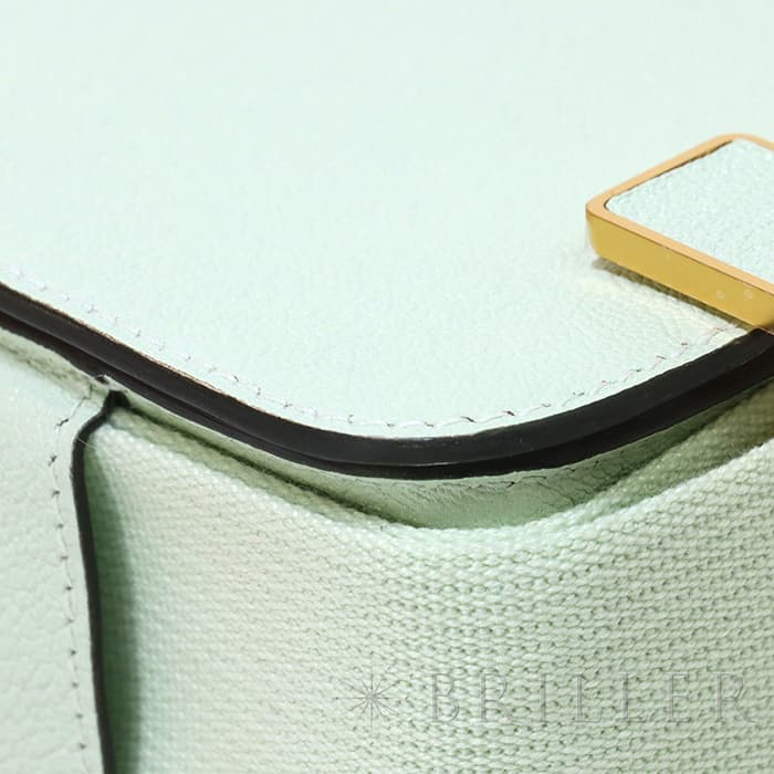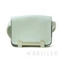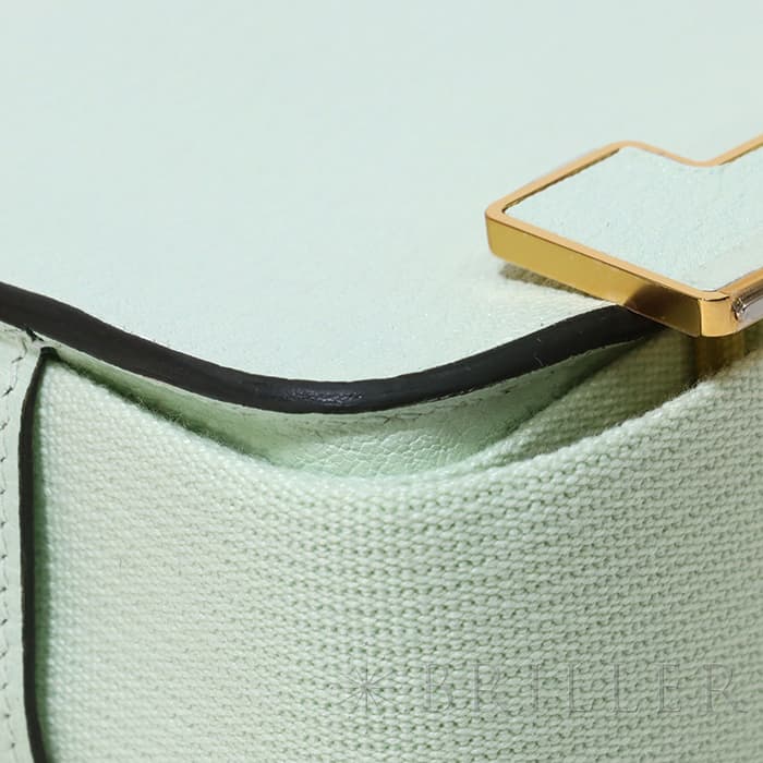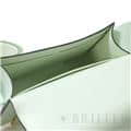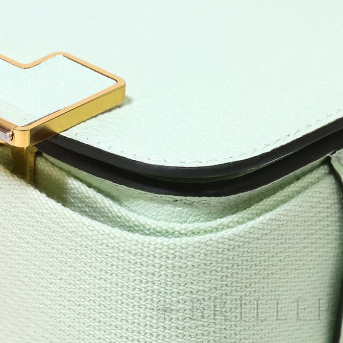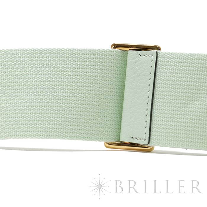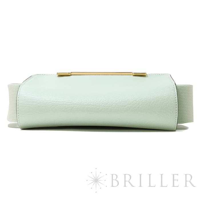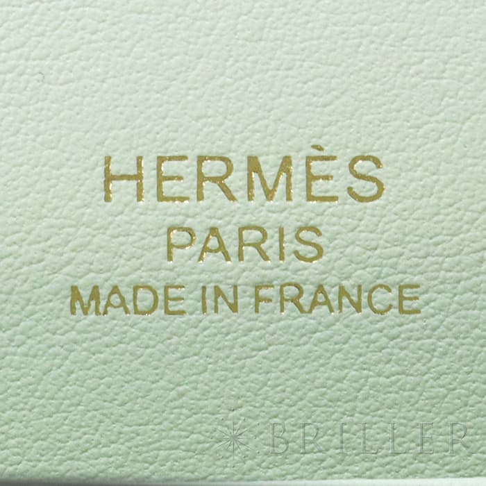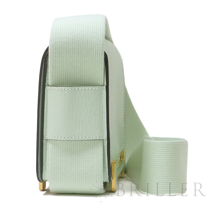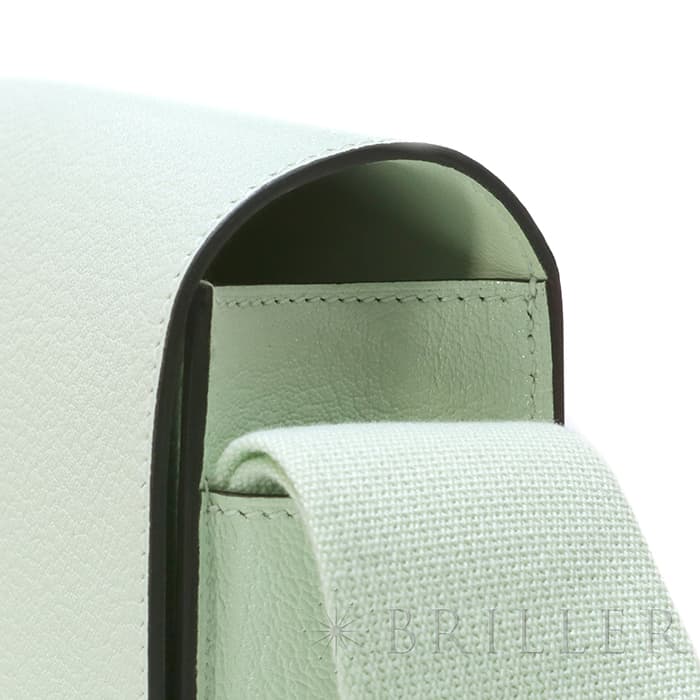 エルメス ゲタ シェーブル ヴェールフィズ ゴールド金具 HERMES 2021年の秋冬コレクションで発表されたエルメスの新作「ゲタ」。日本の下駄からインスピレーションを得て、デザインされたショルダーバッグです。エルメスの頭文字「H」マークの金具がバッグの留め具部分に使用され、さりげなくエルメスらしさを感じるデザインが魅力的です。ころんと丸みを帯びたフォルムが可愛いショルダーバッグで、装いにキュートなアクセントをプラスしてくれるこのサイズは、ショルダーの長さが調節可能なためを1連にして斜め掛けにもでき、2連にして小脇に抱えることも出来る2WAYでお楽しみ頂けます。素材は軽量感に優れ、キズに強く表面の細かい凹凸が美しいのが特徴のヤギ革のシェーブルを使用し、カラーはヴェールフィズでパステル調のグリーンがとてもさわやかで洗練された雰囲気を引き立てています。 B刻印(2023年)、箱に若干のへこみがありますが、その分お求めやすい価格となっております。
