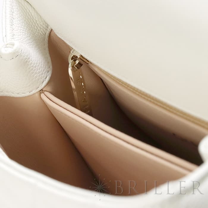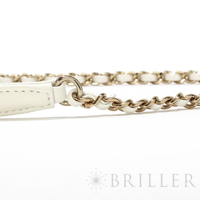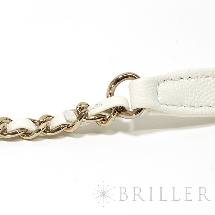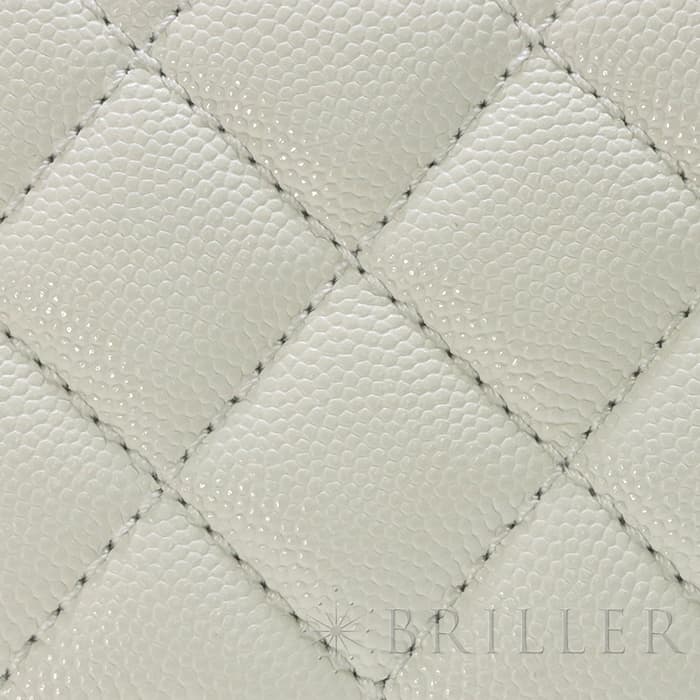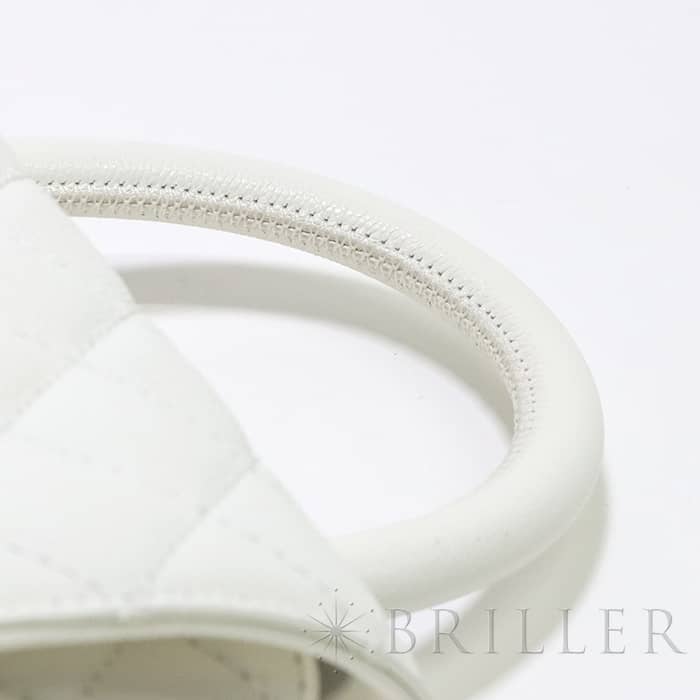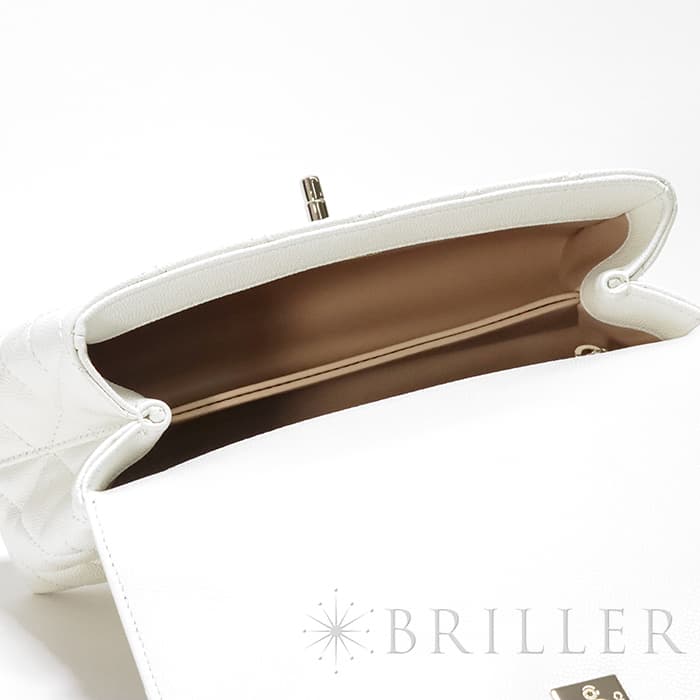 ふっくらとしたキルティングが特徴の「マトラッセ」は、シャネルを代表するバッグのひとつです。素材にはキメ細やかな加工がされた傷や汚れに強いグレインド シャイニー カーフスキンを使用。型崩れしにくくなる効果があるキルティング加工を施すことで、リッチな質感だけでなく、デイリーユースしやすい実用性をも実現しています。裏地の色がピンクベージュとなっており、ブラックの裏地ではなかなか使われない配色となっています。表地のホワイトと見事にマッチしており非常に愛着のもてるカラーリングですサイズは人気の24、ハンドバックとして、付属のショルダーストラップを使って肩掛けスタイルで、と様々なシーンでエレガントでキュートなコーディネートを楽しめ、一つは欲しい万能バッグです。