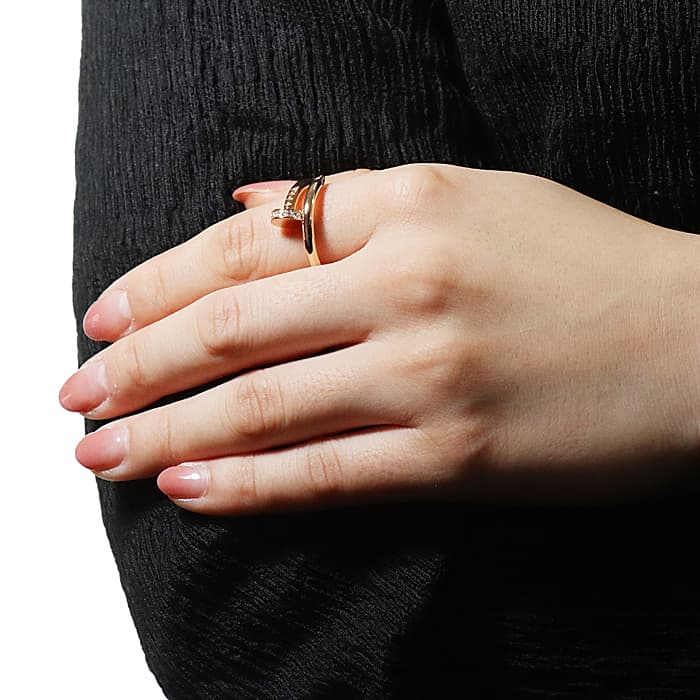 フランスで誕生し、独創的なデザインや技術力の高さから圧倒的な支持を受けるブランド「カルティエ」。1本の釘から誕生したジュエリー「ジュ スト アンクル」は刺激的かつ力強さのあるコレクションです。肌なじみのよいピンクゴールドにダイヤモンドをセッティングしたこちらのリングは、エッジの効いた個性派ジュエリーとしておすすめです。