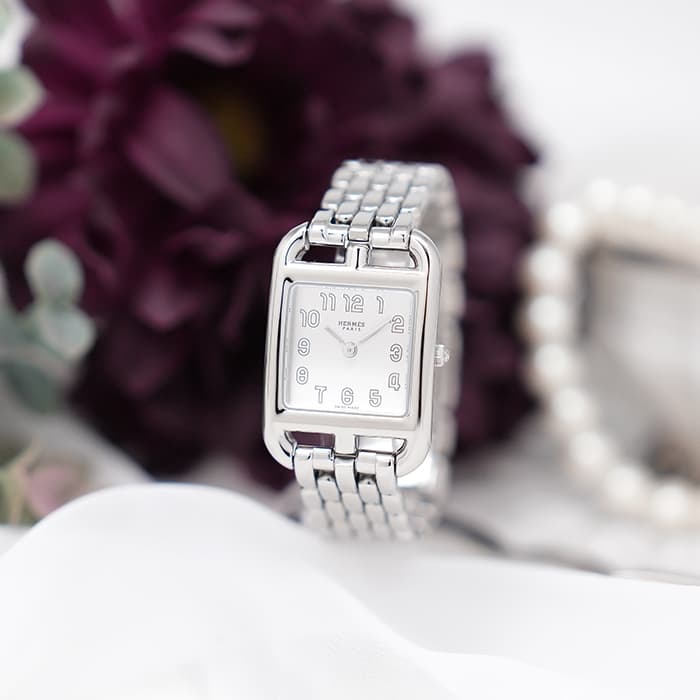 1837年に高級馬具メーカーとして始まり、世界最高峰の革製品ブランドとして、世界中のセレブリティに愛され続けるエルメス。柔らかな曲線が「H」型のケースに施された「ケープコッド」はアメリカ東海岸の高級リゾート地ケープコッドをイメージして作られた時計です。シンプルなダイヤルに5連の連なるステンレススティールブレスレットは涼やかな印象を与え、女性の手首にしっくりと馴染みます。大人の上品な魅力を醸し出しながらも、どこか可愛らしいこの時計は、様々なコーディネートに対応できるオールマイティなデザインとなっています。