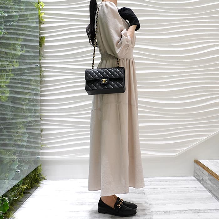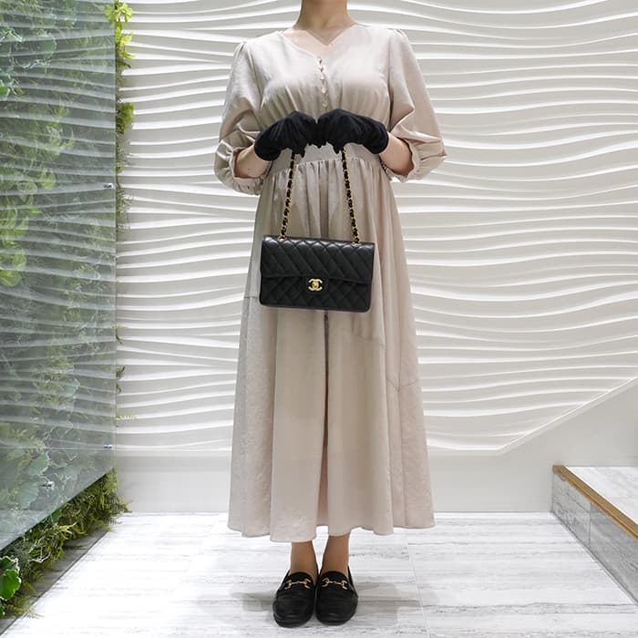 クラシックは、1955年に発表された初代モデル「2.55」を1983年に再デザインした伝統的なモデルです。ふっくらとしたキルティングが特徴の「マトラッセ」は、多くのシャネルのバッグのディテールに起用されています。バッグの前面には、今ではアイコンとなっている2つのCを掛け合わせた「ココマーク」をあしらったデザインが施されています。チェーンストラップは、ダブルで持ち手を短くしたり、シングルで肩掛けにしたり、スタイルに応じて長さを調節することができます。素材には傷や汚れに強いグレインド カーフスキンを使用。キルティング加工を施すことで型崩れしにくくなり、リッチな質感だけでなく、デイリーユースしやすい実用性をも実現しています。代表作にしてシャネルの世界観を存分に味わえるバッグです。