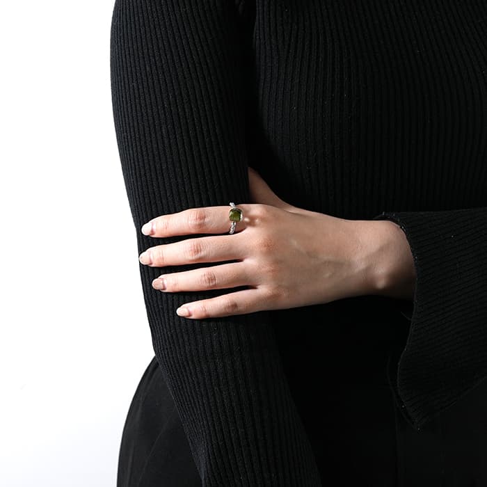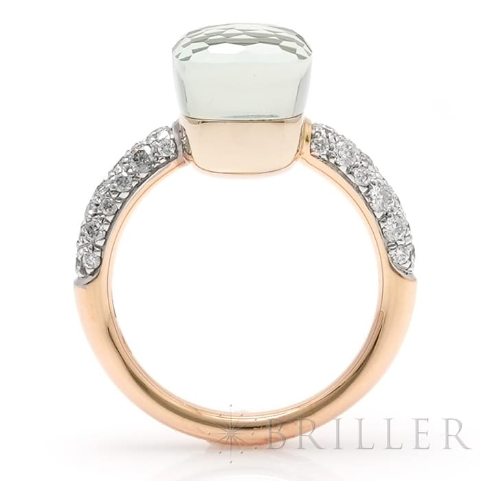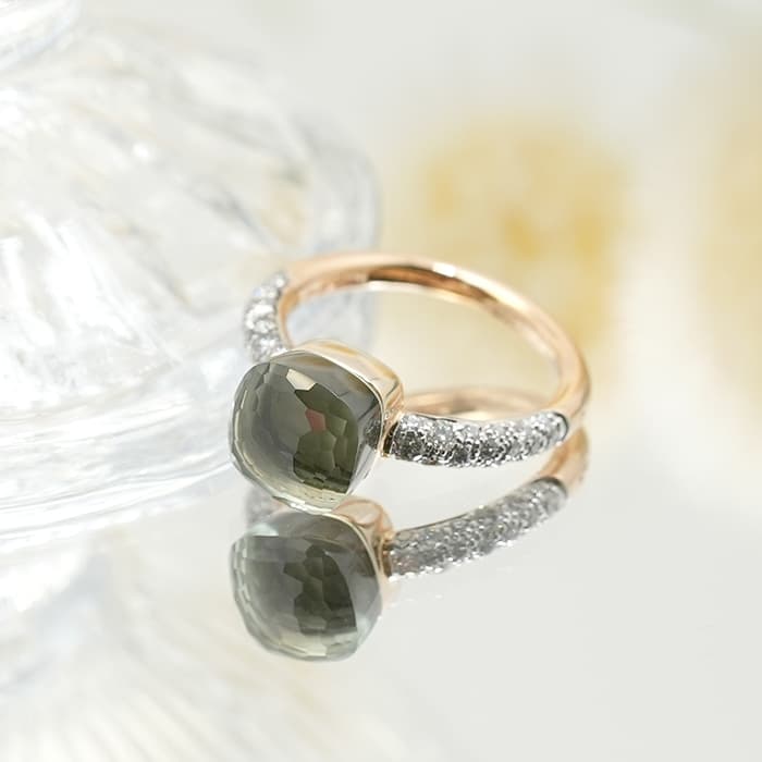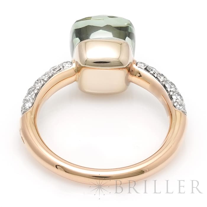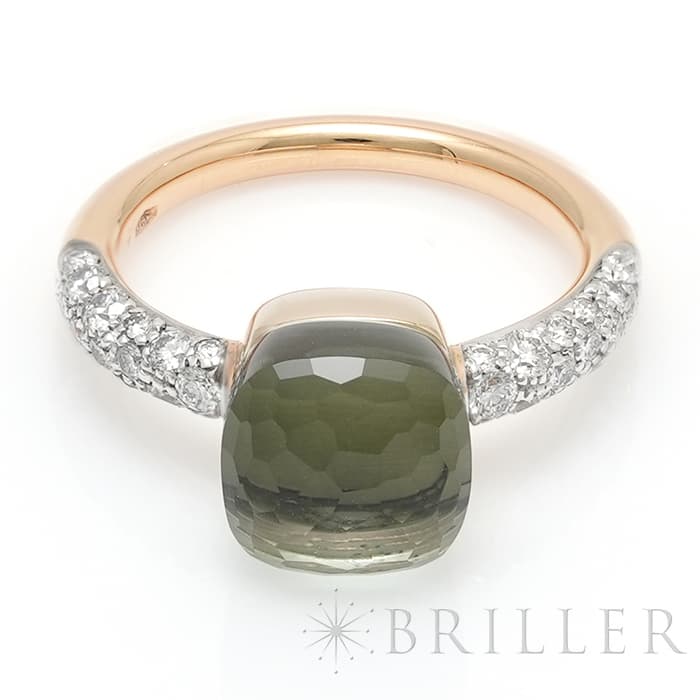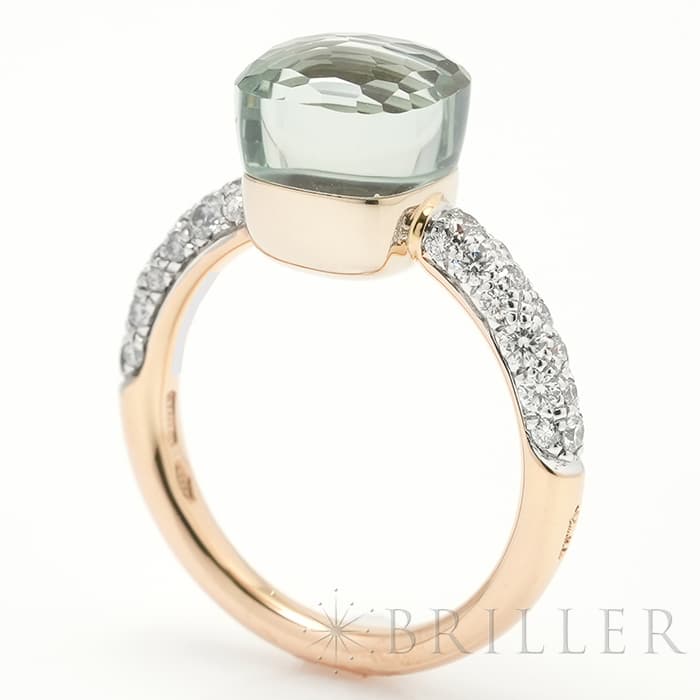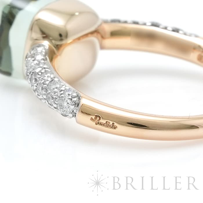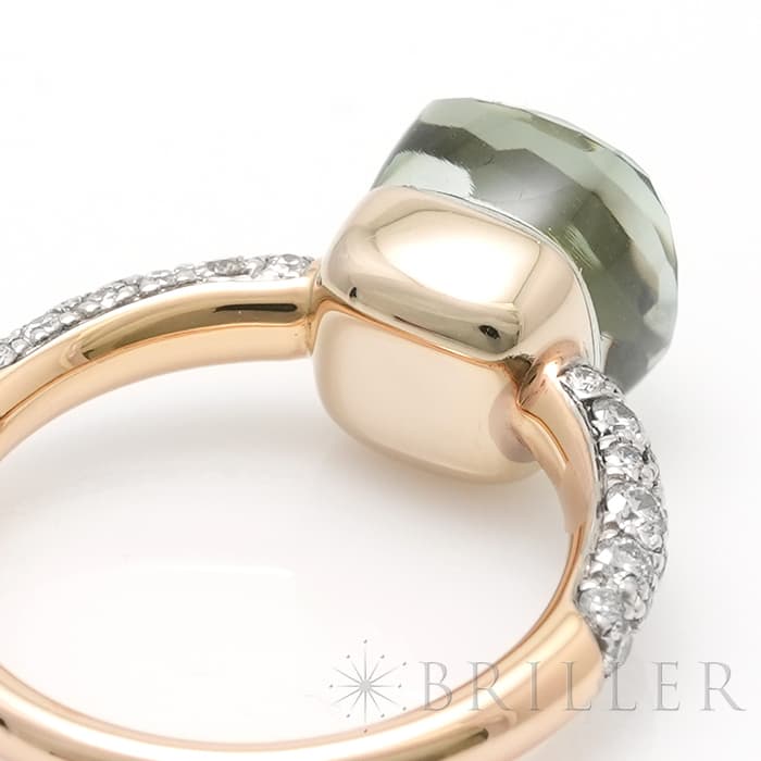 1967年にミラノで生まれたジュエリーブランド「ポメラート(POMELLATO)」。2001年に発表されポメラートのアイコン的ジュエリー「ヌード」が入荷致しました。カラフルなプレシャスストーンは特許を取得している多面のファセットカットとセッティングが施されており、大変美しいシリーズです。ぷっくりとしたストーンなため、1個で指元のアクセントとするも良し。2,3個重ね付けして存在感も出すのも良い楽しみ方の幅が広いリングです。サイズ展開はプチ、クラシック、マキシ、アッソルートと4種類あり、こちらはプチとなります為、1番小さいサイズとなります。「プラシオライト」はグリーンアメジストとしても知られるジェムストーンで、スモーキーな淡いモスグリーンカラーが大人の雰囲気を漂わせます。脇に広がるダイヤモンドと合わさり、上品な高級感を演出しています。