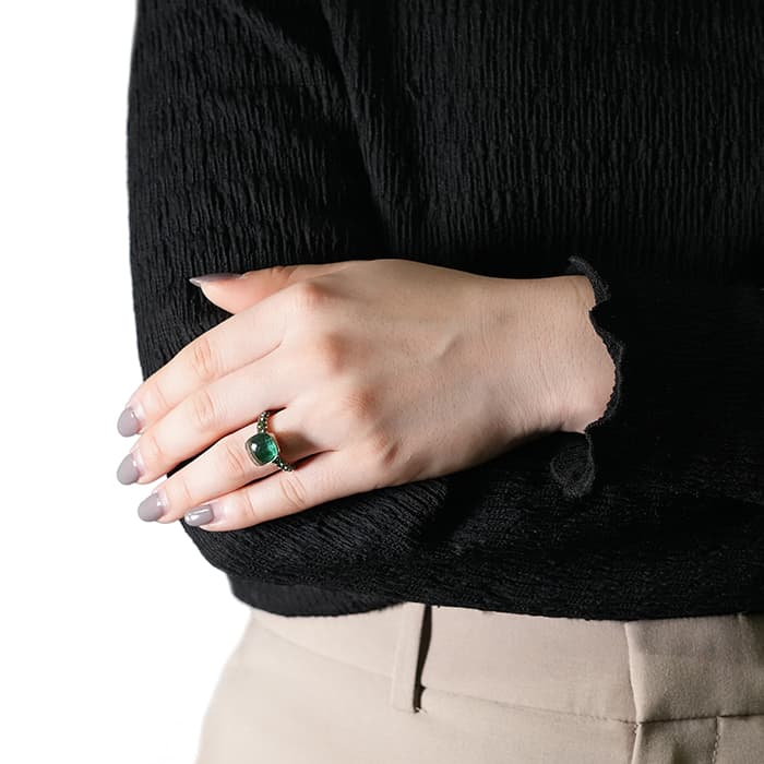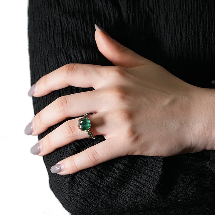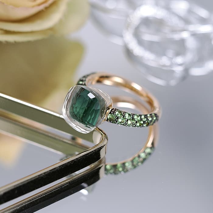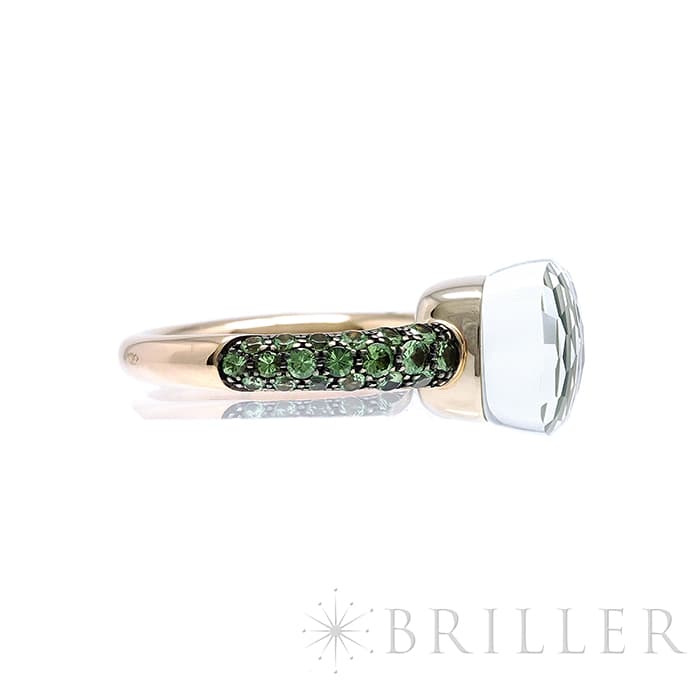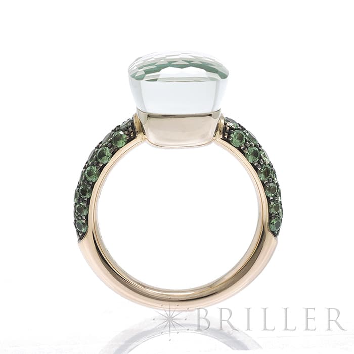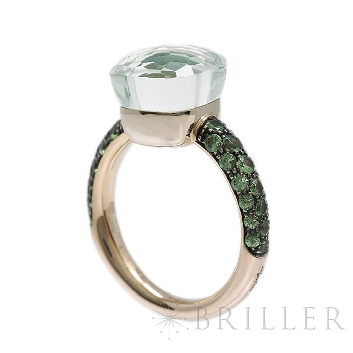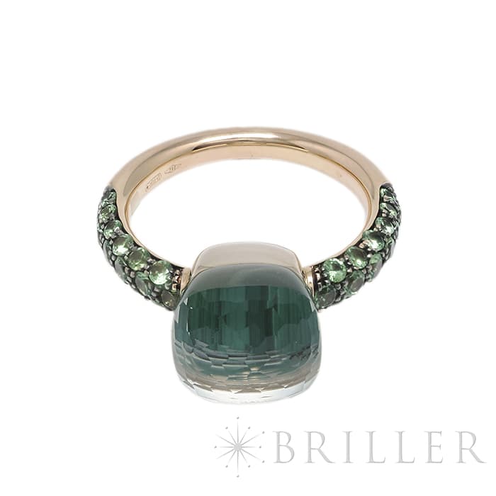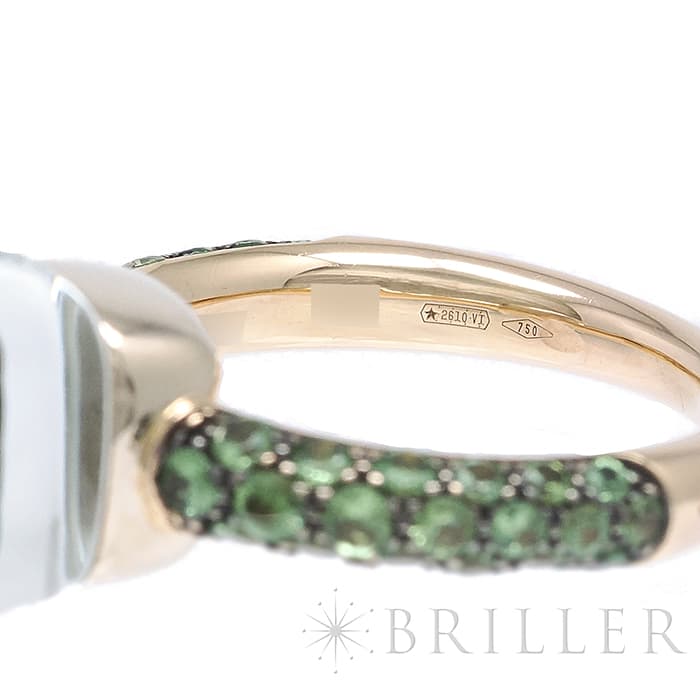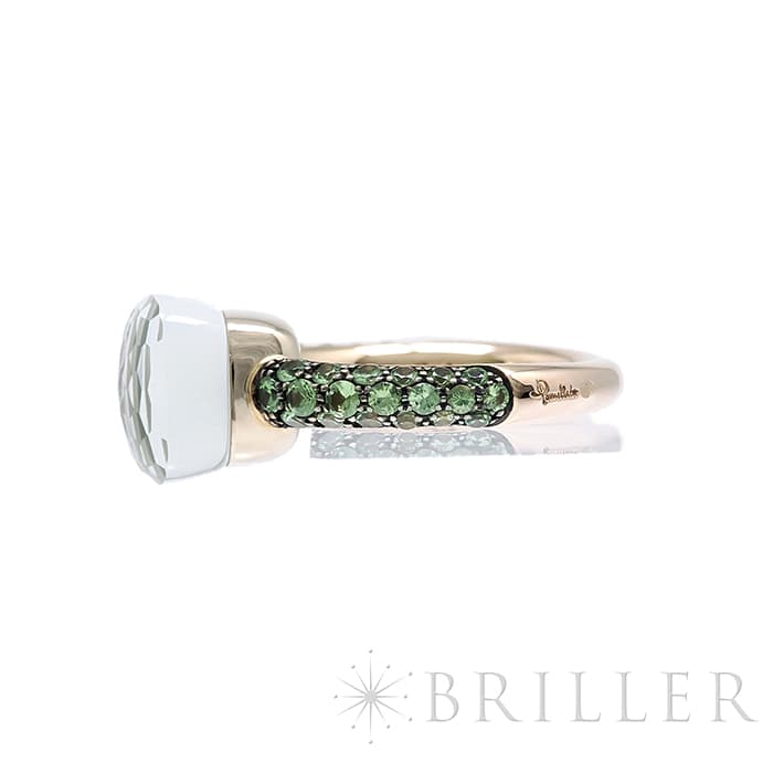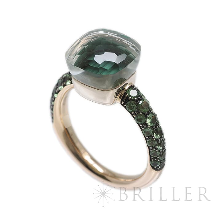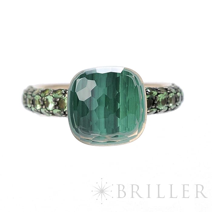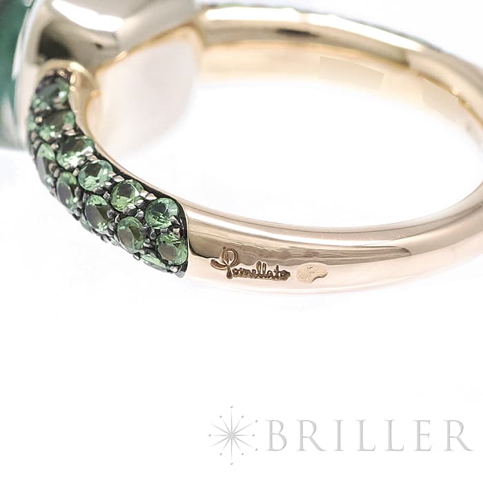 1967年にミラノで生まれたジュエリーブランド「ポメラート(POMELLATO)」。2001年に発表されたポメラートのアイコン的ジュエリー「ヌード」が入荷致しました。特許を取得している美しい多面のファセットカットとセッティングにカラフルなプレシャスストーンが大変美しいシリーズです。「ヌードリング」はぷっくりとしたストーンが存在感を持つため、単体着用で指元のアクセントとするも良し、2,3個重ね付けして存在感も出すのも良いリングです。メインストーンにプラシオライトとマラカイトを使用し、両脇に広がる38粒のツァボライトのパヴェと合わさり、上品な高級感を演出しています。プレゼントにも大変おすすめなリングです。