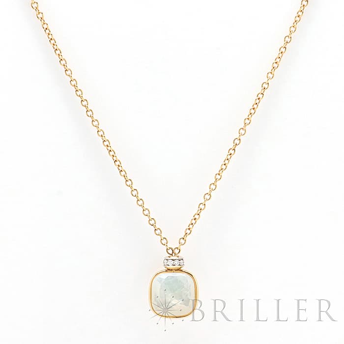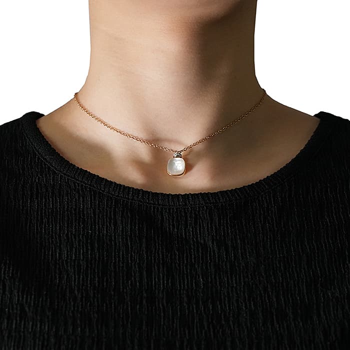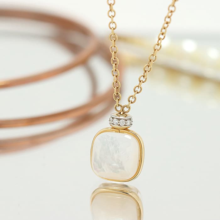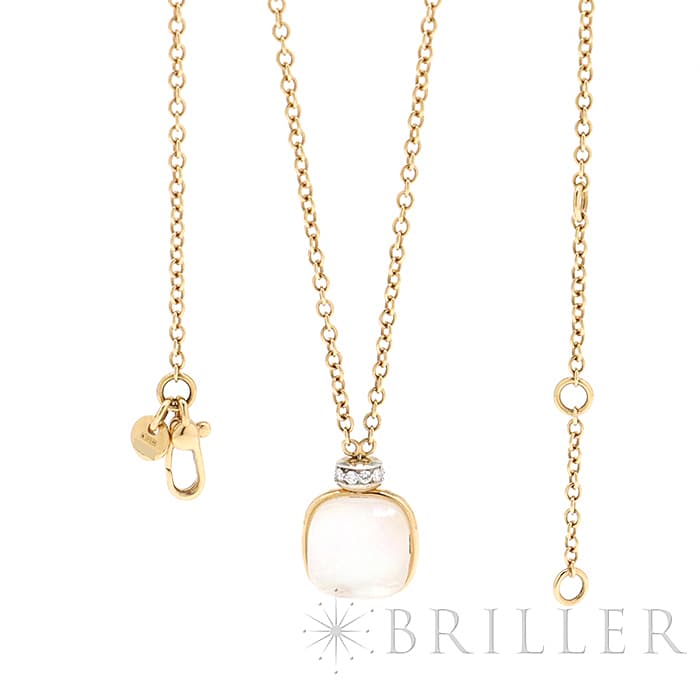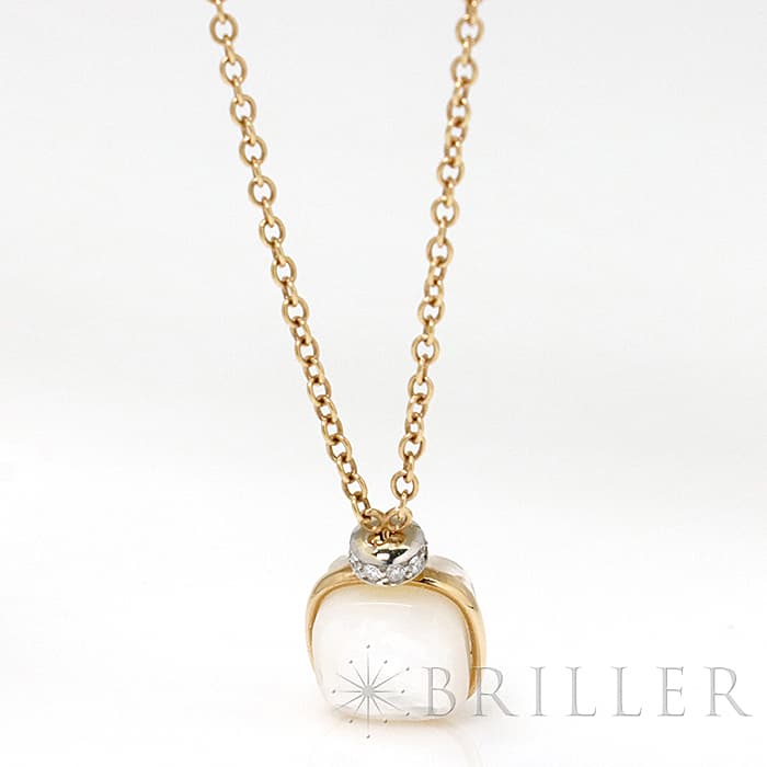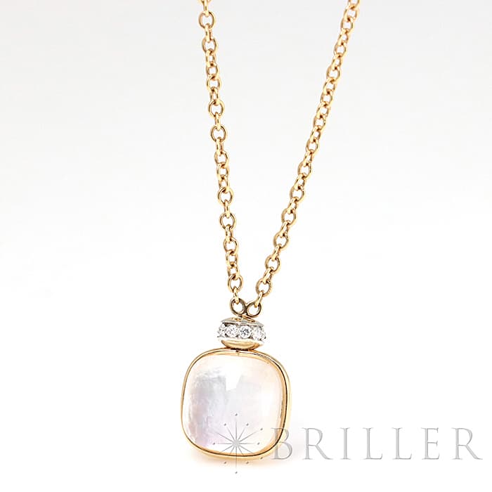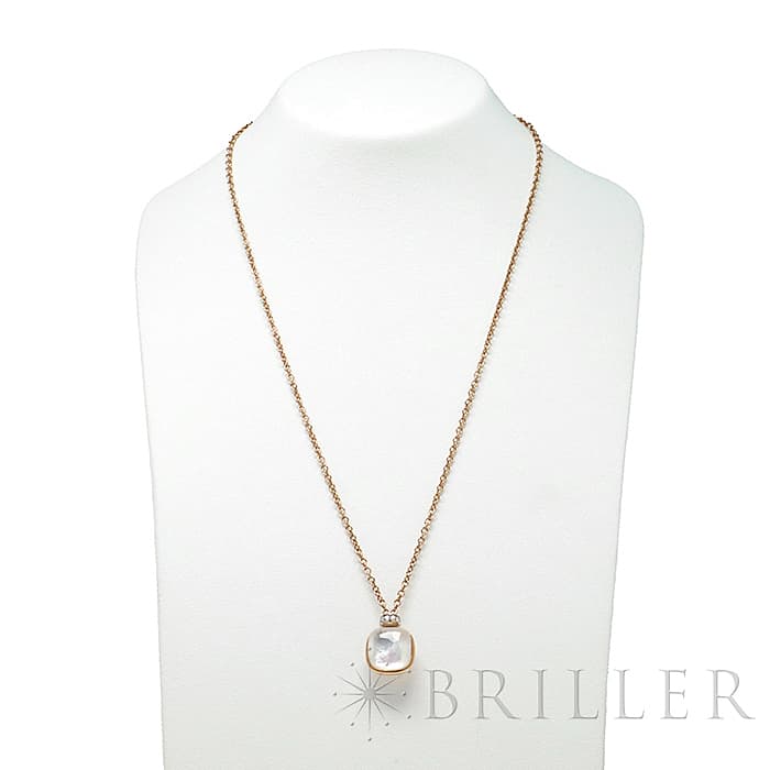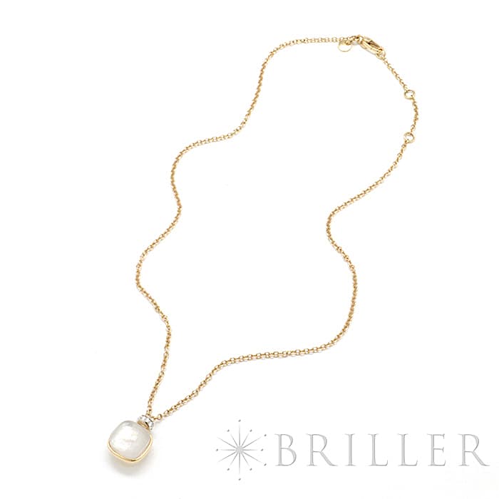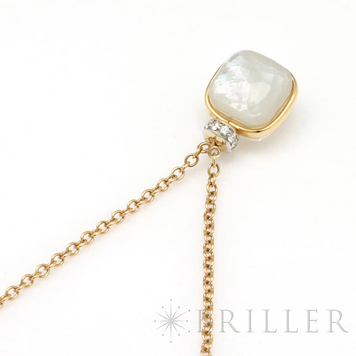 1967年にミラノで生まれたジュエリーブランド「ポメラート(POMELLATO)」。 2001年に発表されたポメラートのアイコン的ジュエリー「ヌード」が入荷致しました。 特許を取得している美しい多面のファセットカットとセッティングにカラフルなプレシャスストーンが大変美しいシリーズです。 こちらのネックレスは中央をゴールドで囲んでいるデザインとなり、ホワイトトパーズとマザーオブパールの美しい輝きが最大限活かされています。また、上部に10粒のダイヤモンドをセッティングし高級感溢れるネックレスです。