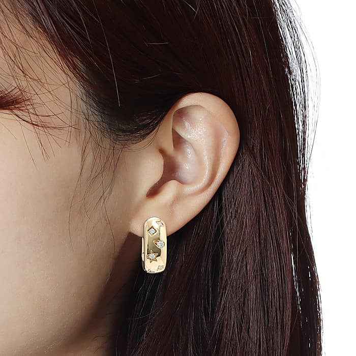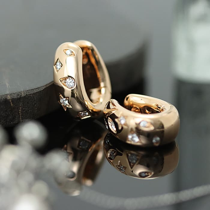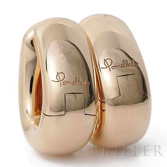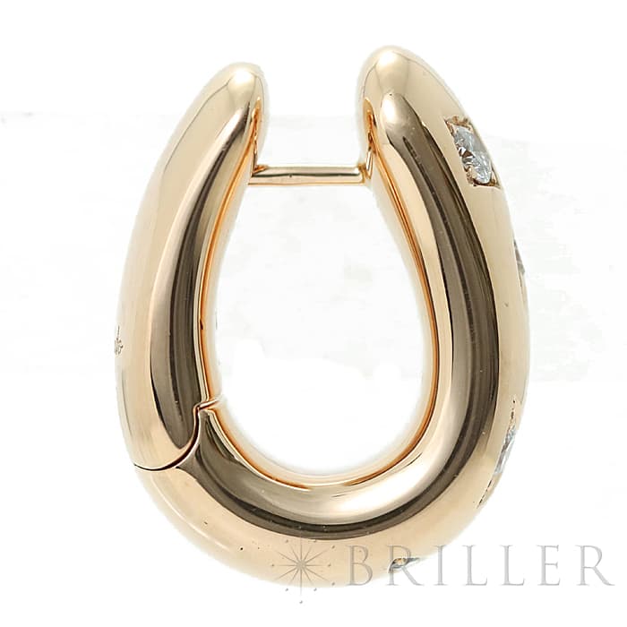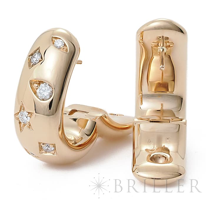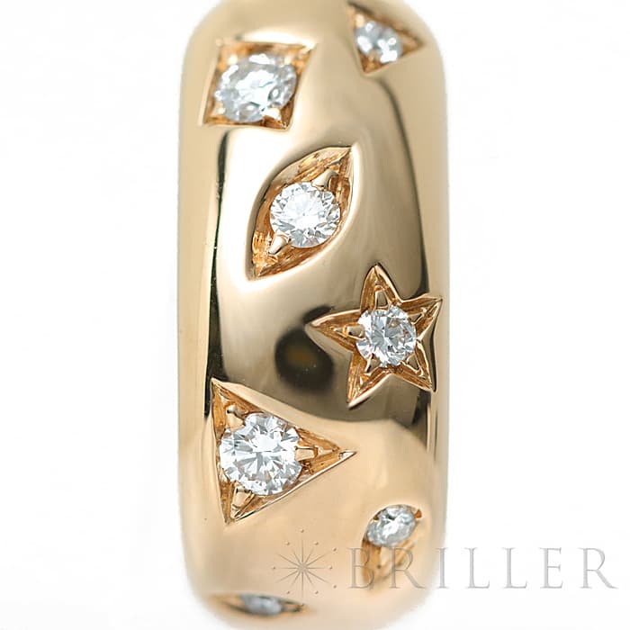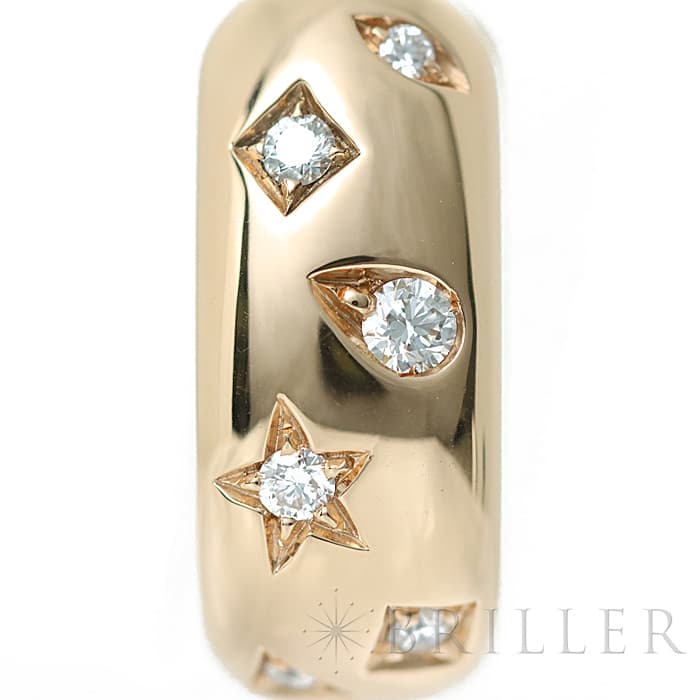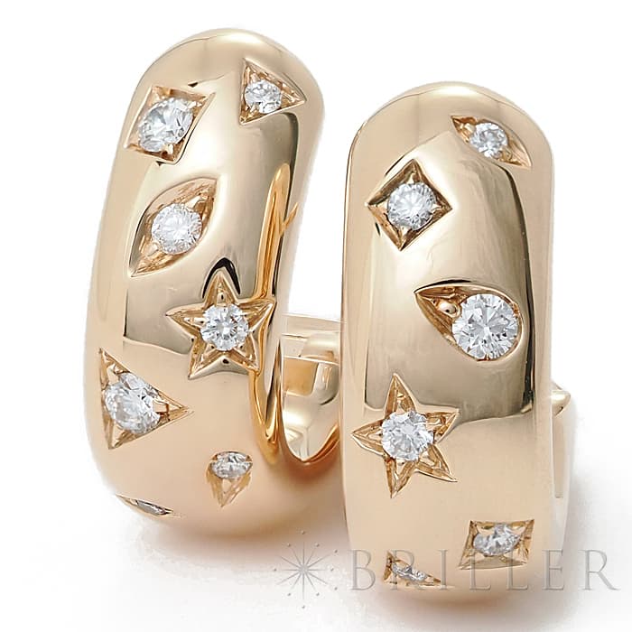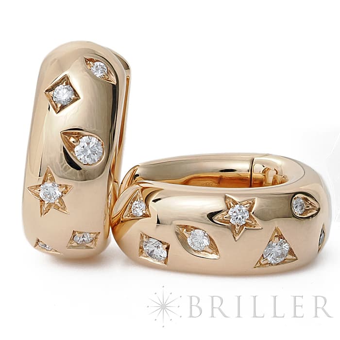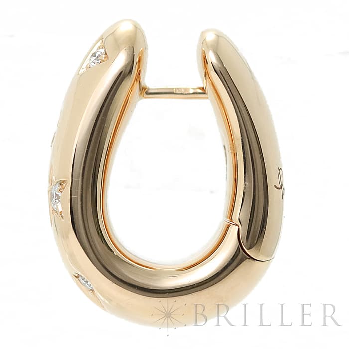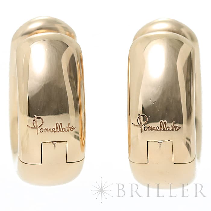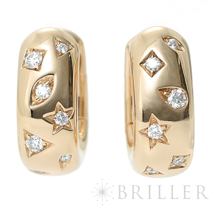 1967年にミラノで生まれたジュエリーブランド「ポメラート(POMELLATO)」。 ポメラート創立50周年を機に新たに加わった「イコニカ」は、ボリューム感のある大きさながら美しい曲線美を描き上品な雰囲気を演出するシリーズです。 こちらのイヤリングはイコニカらしい大胆な大きさながらシンプルなローズゴールド素材に遊び心豊かに星形、三角、四角に嵌め込まれた13粒(0.4ct)のダイヤモンドが輝きを放ちます。