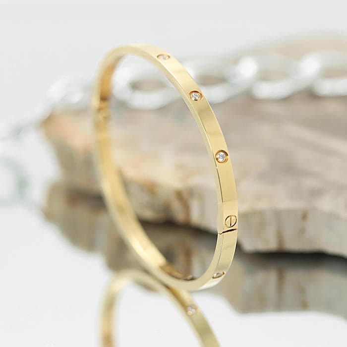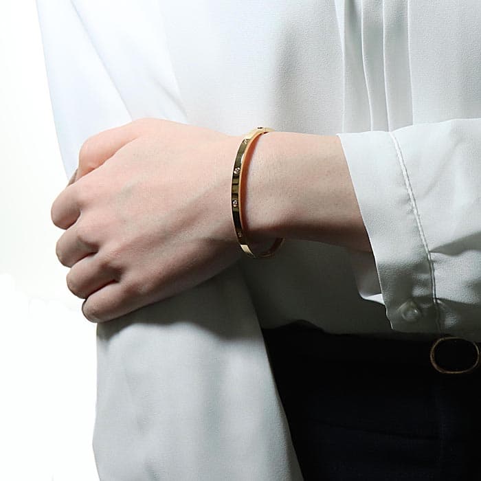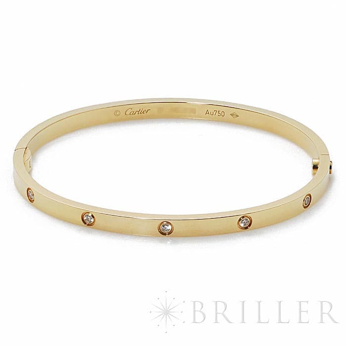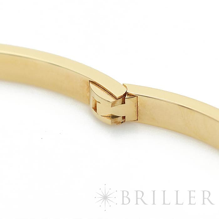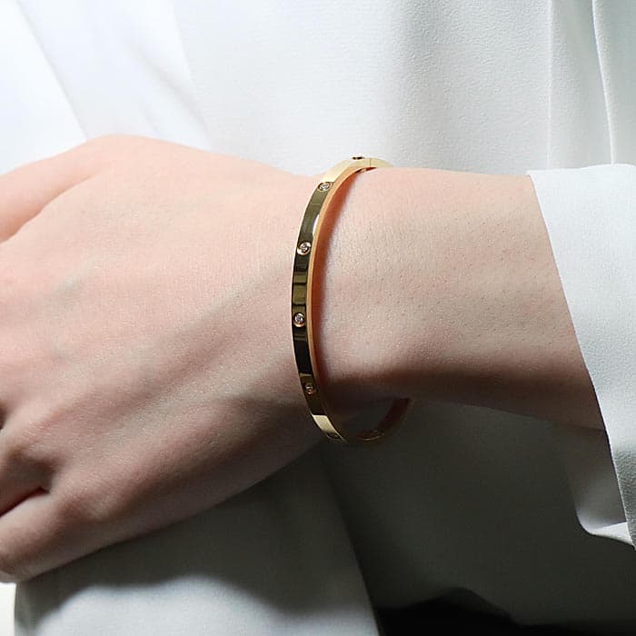 世界5大ジュエラーのひとつである「カルティエ」。1970年代にニューヨークで生まれたLOVE コレクションは、愛の絆を象徴するビスモチーフが特徴のコレクションです。こちらは華やかなイエローゴールド素材にビスの代わりとしてブリリアントカットの贅沢なダイヤモンドを配置。細身のため、単体でも重ね付けをしても美しく収まります。バングル型のシンプルなデザインのため、コーディネートに合わせやすくおすすめのです。