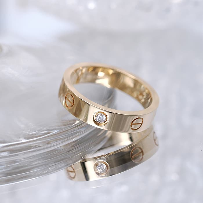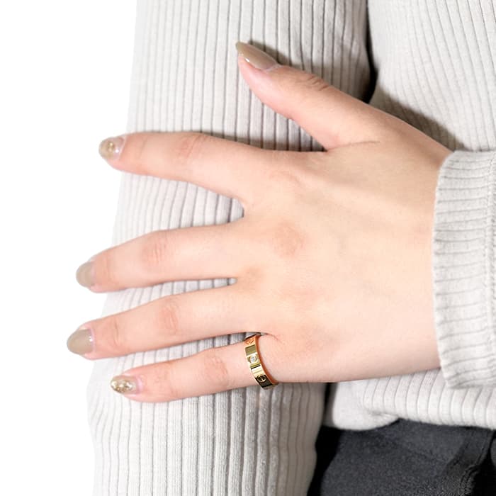 世界5大ジュエラーとして世界中から愛されるブランド「カルティエ」。カルティエが手掛ける「束縛」や「愛の絆」をテーマにして作られた「ラブコレクション」は、老若男女問わず不動の人気を博しています。その中でも、「愛を閉じ込める」という意味のビスマークが刻印された「ラブリング」は、ペアリングとして購入される方も非常に多い人気ラインです。ダイヤモンドをポイント使いしているこちらのリングには華やかなイエローゴールドを使用しており、上品かつゴージャスにお手元を彩ります。