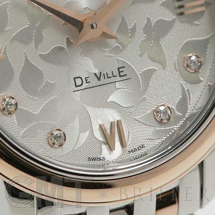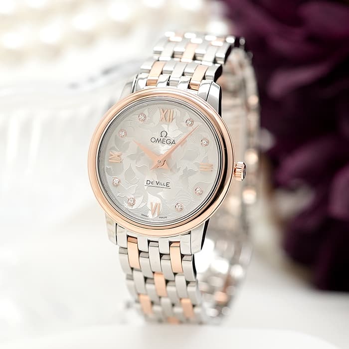 オメガ「デ・ヴィル」は、1967年にシンプルで流行に左右されず、年齢やスタイルを問わず着けられる時計として登場しました。ダイヤルにはバタフライの模様がデザインされ、10ポイントダイヤモンドインデックスがシリーズの名前の由来である、「デ・ヴィル」(仏語「都会的な」)に相応しい、控え目でありながらエレガントな仕上がりになっています。