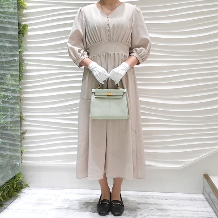 「ケリー」は元々「サック・ア・クロア」という名前で1935年に誕生。 女優であったグレース・ケリーがモナコ王妃となり、妊娠した様子を鞄でとっさに隠した写真が話題になり、後に「ケリーバッグ」と称されました。こちらのケリーのサイズは25で、長財布や350mlペットボトルを横に収納することができます。内縫いタイプは丸みを帯びた柔らかなフォルムで、小ぶりな25サイズの可愛らしさを引き立たせます。