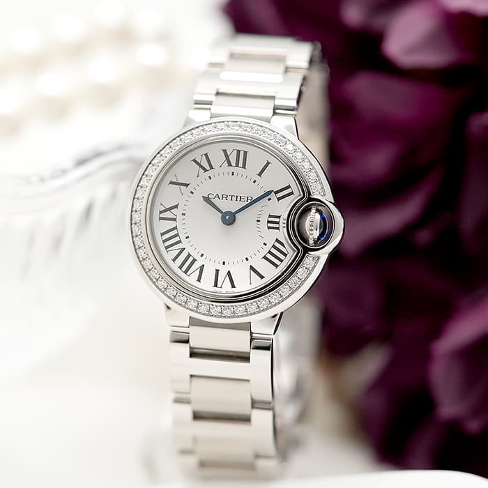 カルティエが誇るハイクラスウォッチ「バロンブルー」。気品溢れるラウンドケースや美しいダイヤルデザインは芸術作品のような視覚的魅力を存分に感じます。女性の腕へとフィットするサイズ感はとても心地よく安心の電池式ムーヴメントを搭載。タンク、サントスに続く新たな人気定番モデルです。特徴的なのはリューズを保護するように覆われたデザインで、誤操作防止という実用面だけでなく、全体的に柔らかい印象を与えてくれます。ベゼルのダイヤがラグジュアリーな雰囲気を作っています。