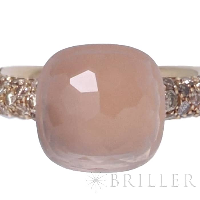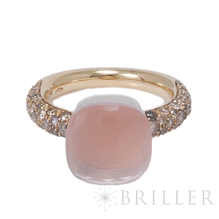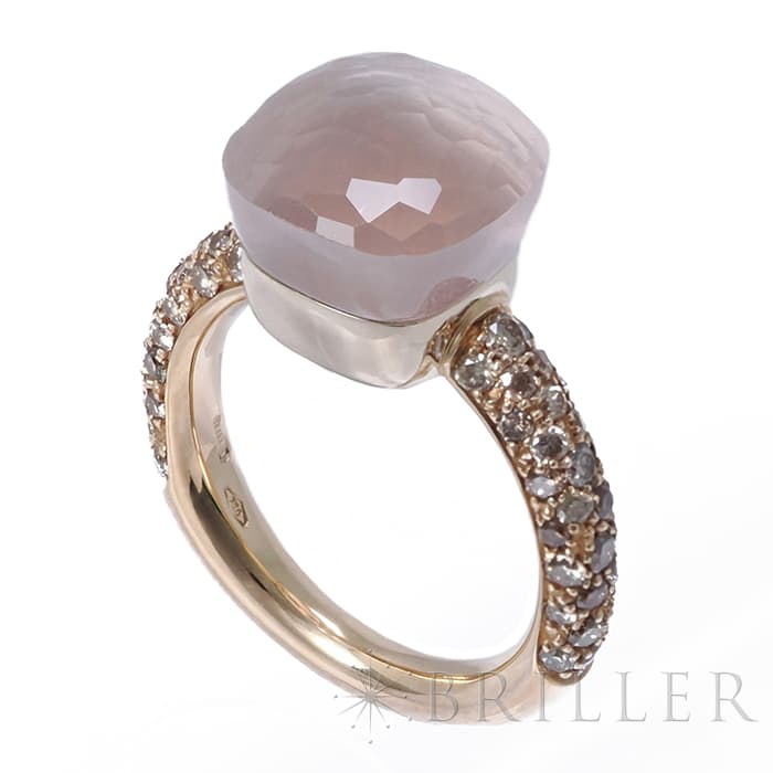 1967年にミラノで生まれたジュエリーブランド「ポメラート(POMELLATO)」。2001年に発表されポメラートのアイコン的ジュエリー「ヌード」が入荷致しました。カラフルなプレシャスストーンは特許を取得している多面のファセットカットとセッティングが施されており、大変美しいシリーズです。ぷっくりとしたストーンなため、1個で指元のアクセントとするも良し。2,3個重ね付けして存在感も出すのも良い楽しみ方の幅が広いリングです。サイズ展開はプチ、クラシック、マキシ、アッソルートと4種類あり、こちらはクラシックとなります為、2番目に小さいサイズとなります。カルセドニーとローズクォーツのメインストーンは大変華やかで、両脇に広がる58粒のブラウンダイヤモンド(0.7カラット)と合わさり、上品な高級感を演出しています。プレゼントにも大変おすすめなリングです。