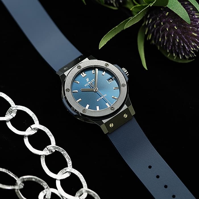 フランス語で「舷窓」を意味するスイスの高級時計ブランド「ウブロ」。ウブロの時計は舷窓からインスピレーションを得て作られたビスで留めたベゼルが特徴的です。また、今までの高級時計にはなかった異素材の組み合わせをして人気を集めました。独特な世界観を持つウブロの、スポーティーでありエレガントなモデル「クラシックフュージョン」。ブラックセラミックのケースに、ブルーのダイヤル、ストラップを組み合わせ。シンプルな機能なので、ケース厚は10mmに厚みに、約70gという軽量に仕上がっています。