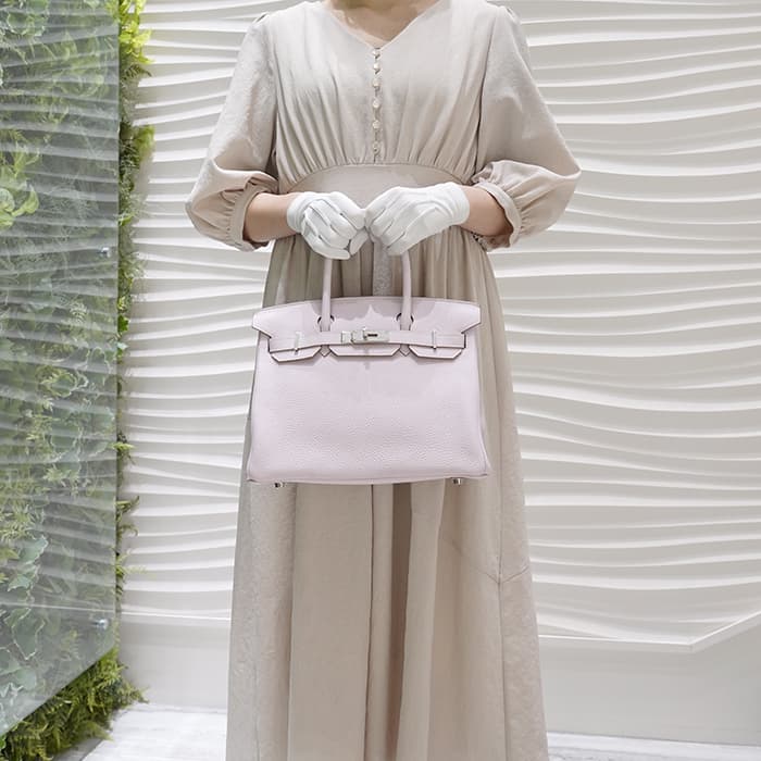 「バーキン」の由来は女優の「ジェーン・バーキン」が航空機でエルメスの社長と出会い、物があふれかえりそうになっている彼女のバッグを見て、収納がたくさんできるバッグとして創られました。整理せず物を入れることができる秀逸な「バーキン」は全世界で愛されています。柔らかな質感のトリヨン素材に可憐で軽やかなグレイッシュピンク・モーヴペールにシルバー金具の組み合わせはシックかつ上品な印象を演出します。