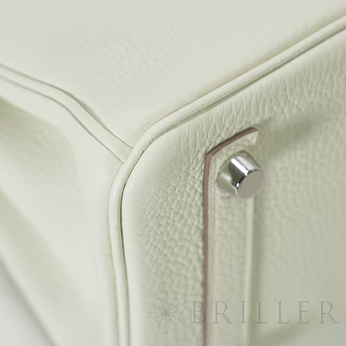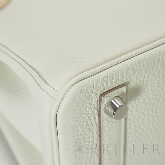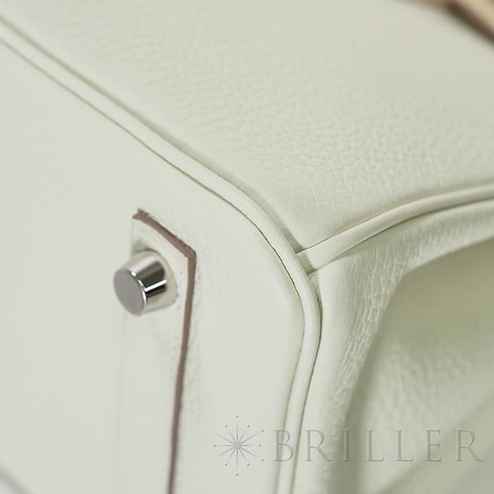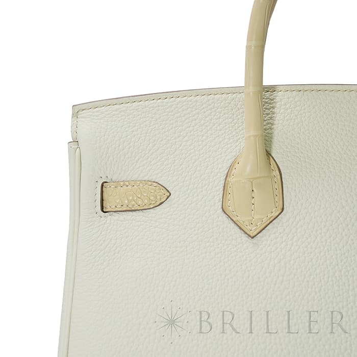 バーキンにアリゲーターを組み合わせた特別な「バーキンタッチ」。 フラップ・ハンドル・ベルトにはアリゲーターを使用しており、抜群の存在感を発揮しています。アリゲーターのマットな質感がラグジュアリーな雰囲気を醸しつつバニラカラーが華やかな印象です。マッシュルームはホワイトにほのかなやわらかな雰囲気をプラスしたエレガントな色合いです。