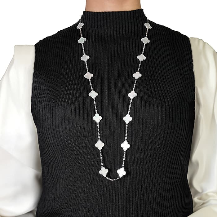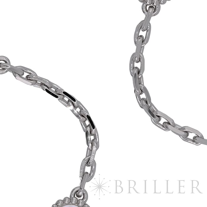 1902年にパリのヴァンドーム広場から始まった世界5大ブランドの1つ、ヴァンクリーフ&アーペル。ヴァンクリーフ&アーペルの象徴とも言える、幸運の象徴の四つ葉のクローバーをデザインした「アルハンブラ」コレクション。 ロングネックレスのこちらは、20個ものアルハンブラモチーフが使用されており、どこから見てもアルハンブラが存在感たっぷりに、コーディネートに華やかさと可愛らしさをプラスします。2連にして着ければ、格別のラグジュアリーな雰囲気を楽しめます。 18金ホワイトゴールドとマザーオブパールの組み合わせが高貴な雰囲気すら漂わせ、大人の品格を感じさせる特別感たっぷりのジュエリーです。