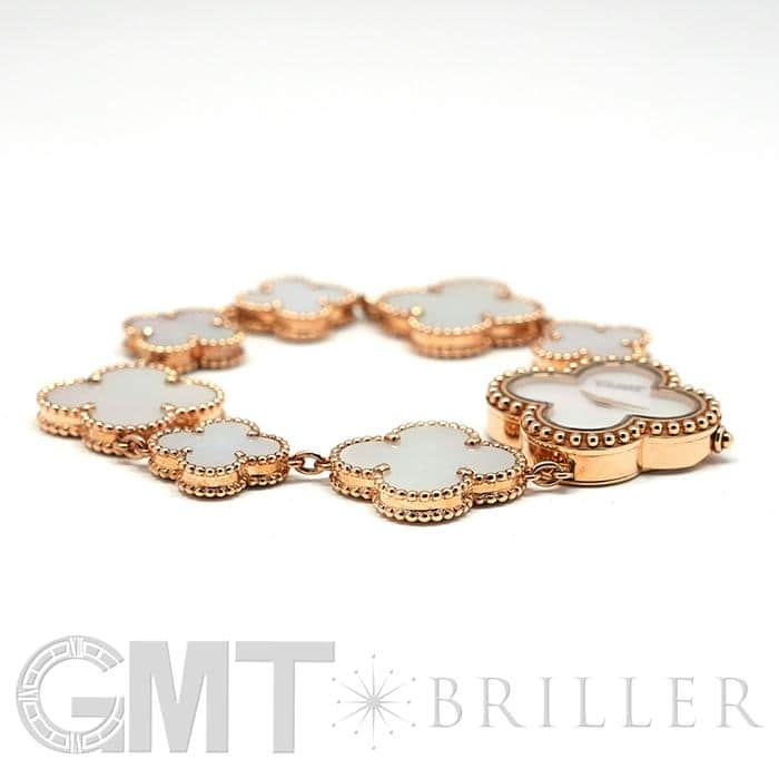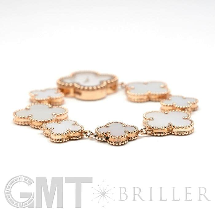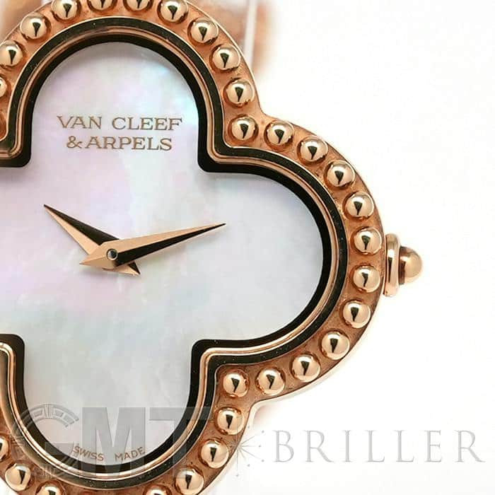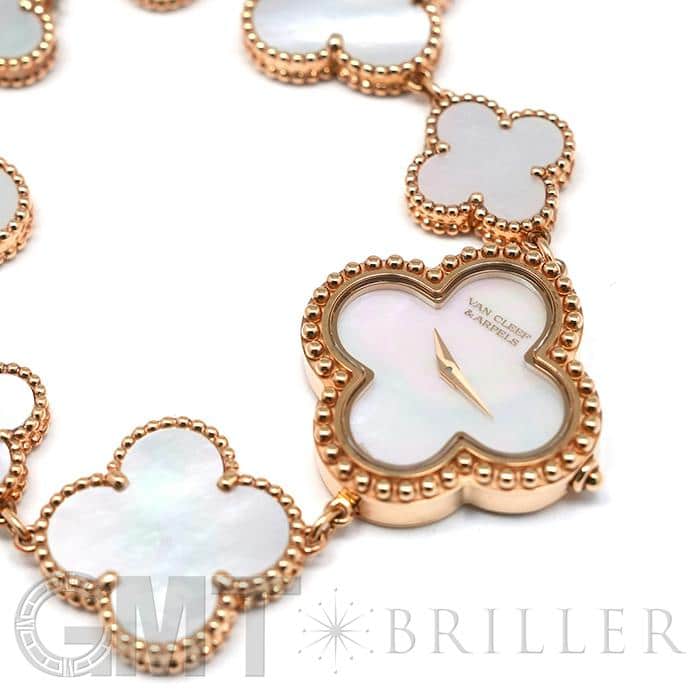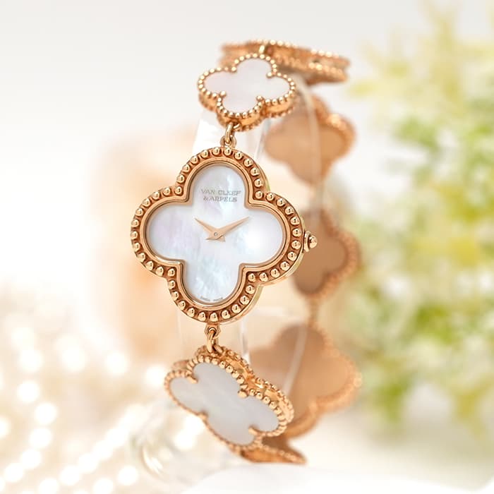 1968年に誕生した、ヴァンクリーフ&アーペルを象徴する「アルハンブラ」コレクション。 四葉のクローバーをモチーフにした可愛らしいデザインは、ジュエリーのみならず腕時計としても高い人気を誇っています。ヴィンテージ アルハンブラのラウンドビーズセッティングを取り入れ、サイズの異なるアルハンブラ モチーフを交互に配したデザインが特徴的。イエローゴールドにホワイトマザーオブパールが印象的な可愛らしくも存在感がある腕時計です。