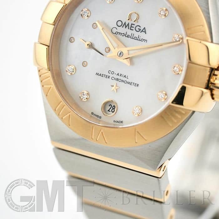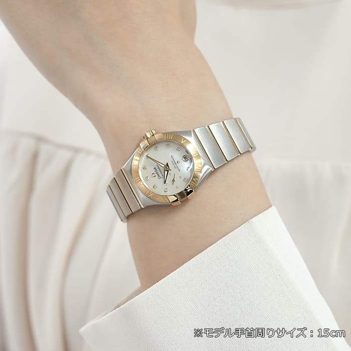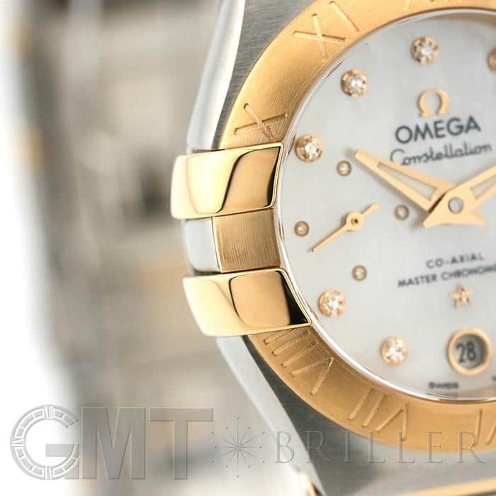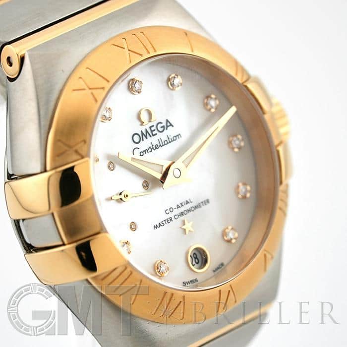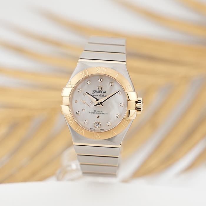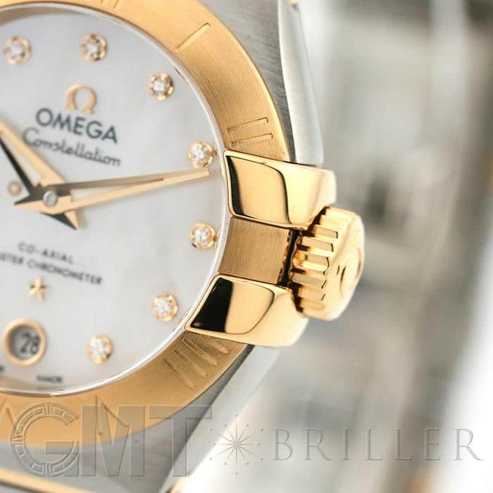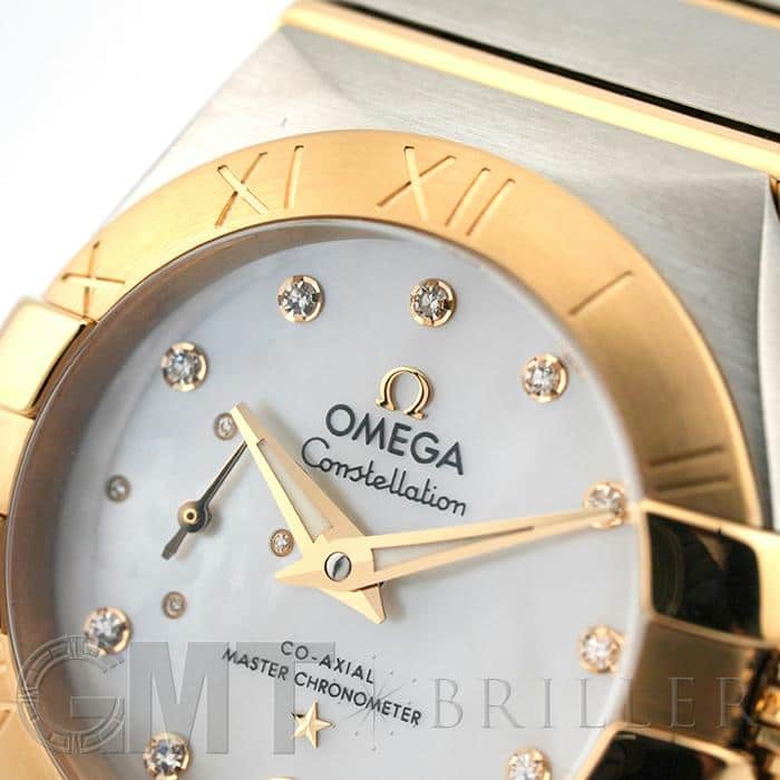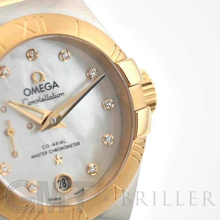オメガの定番モデルの1つである「コンステレーション」。 メンズとレディースどちらも数多くの種類を持ち、ペアウォッチとしても人気の高いシリーズです。 3・9時位置のベゼルにある「爪」と呼ばれる部分がポイントとなります。 ケースとブレスレットが一体型となった作りで、繋ぎの部分が横方向に半月状にカットされており自然な繋がりを演出。 ムーブメントはオメガ独自開発のコーアクシャル「Cal.8704」ですので、精度の高さと耐久性はお墨付きです。 9時位置にはスモールセコンド、6時位置には日付表示を配置した高級感のあるマザーオブパールの文字盤。 インデックスとスモールセコンドにはダイヤモンドをセッティングしており、イエローゴールドとステンレスケースのコンビと合わさることで大変上品で華やかな印象になります。