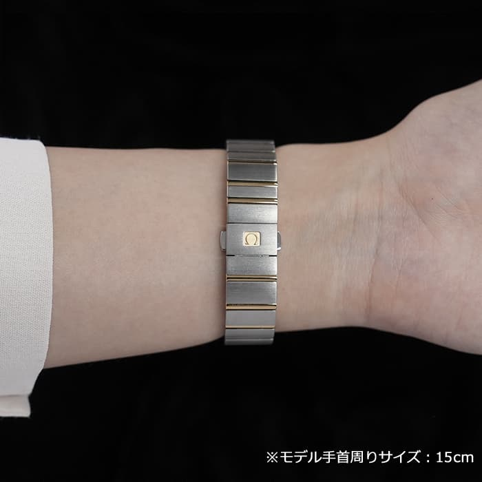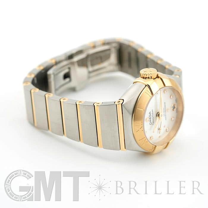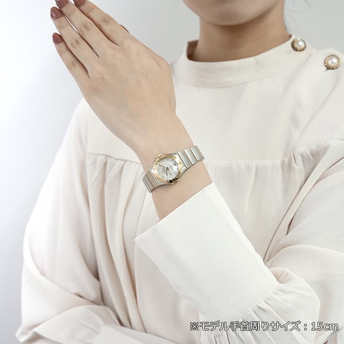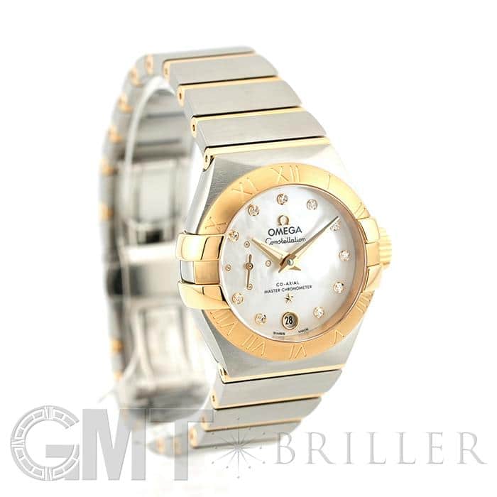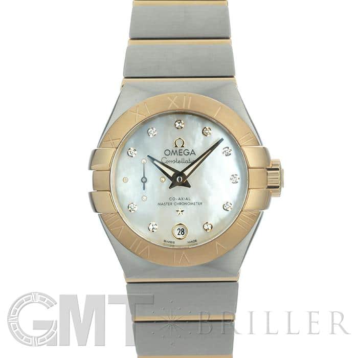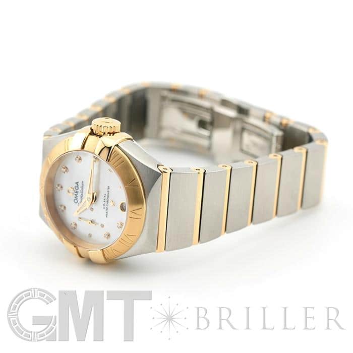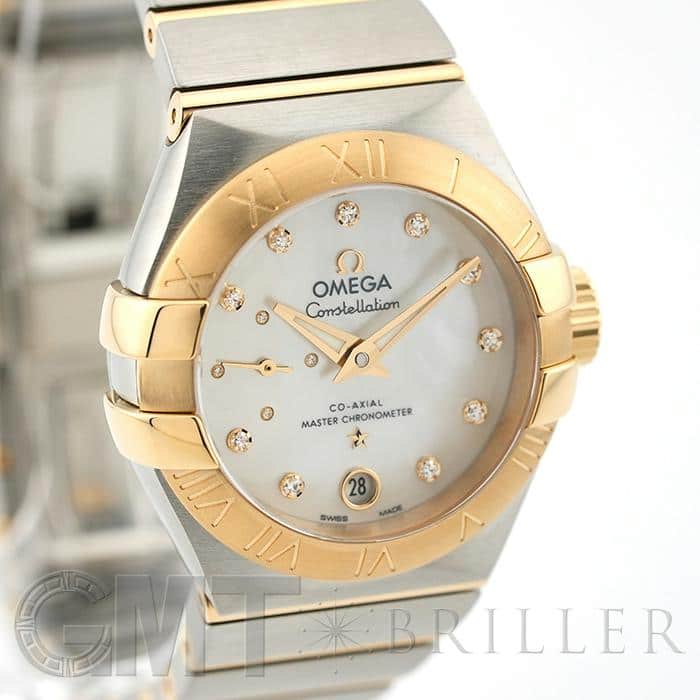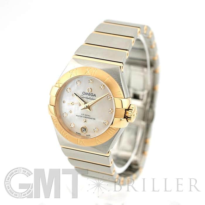 オメガの定番モデルの1つである「コンステレーション」。 メンズとレディースどちらも数多くの種類を持ち、ペアウォッチとしても人気の高いシリーズです。 3・9時位置のベゼルにある「爪」と呼ばれる部分がポイントとなります。 ケースとブレスレットが一体型となった作りで、繋ぎの部分が横方向に半月状にカットされており自然な繋がりを演出。 ムーブメントはオメガ独自開発のコーアクシャル「Cal.8704」ですので、精度の高さと耐久性はお墨付きです。 9時位置にはスモールセコンド、6時位置には日付表示を配置した高級感のあるマザーオブパールの文字盤。 インデックスとスモールセコンドにはダイヤモンドをセッティングしており、イエローゴールドとステンレスケースのコンビと合わさることで大変上品で華やかな印象になります。