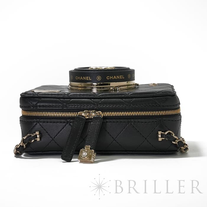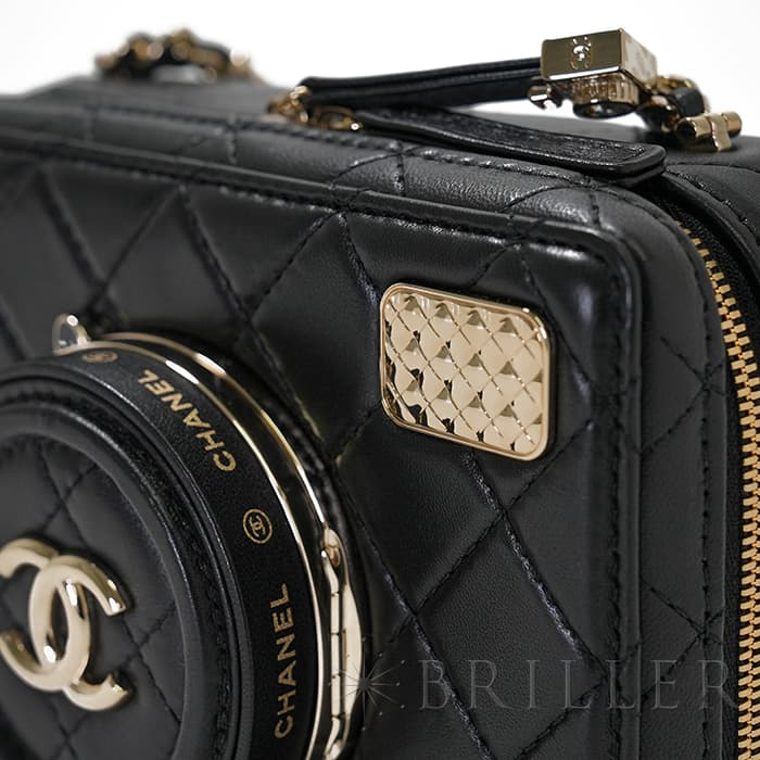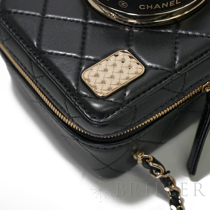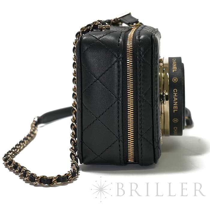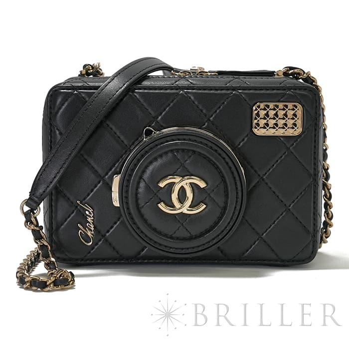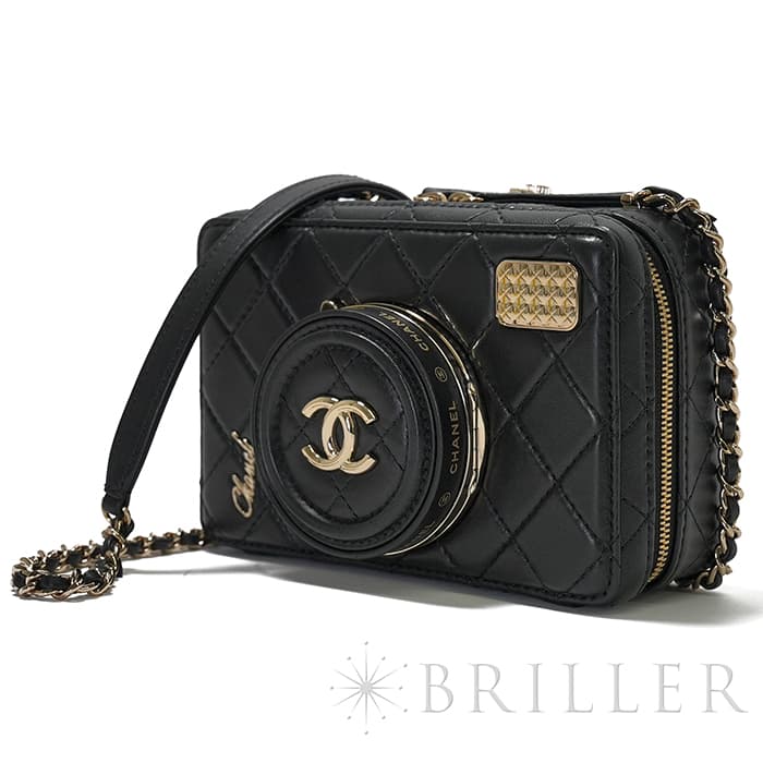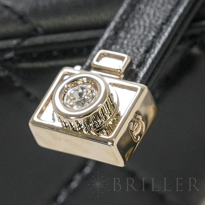 シャネル2024SS新作のカメラをデザインしたショルダーバッグが入荷しました。ココマークが入ったレンズ部分は開くと中にミラーが備え付けられています。また、フラッシュ部分はマトラッセ柄にキラキラ輝くを放ちます。ファスナーの持ち手部分にもカメラがデザインされており、遊び心のあるかわいいバッグです。シックなブラックに滑らかな手触りのラムスキンを使用。型崩れしにくくなる効果があるキルティング加工を施すことで、リッチな質感だけでなく、デイリーユースしやすい実用性をも実現しています。