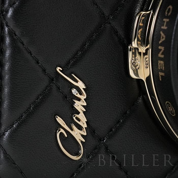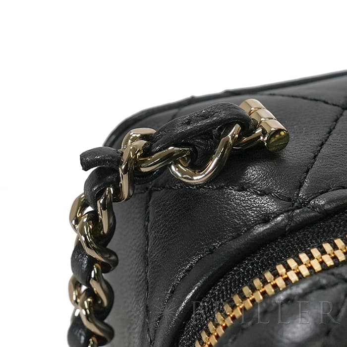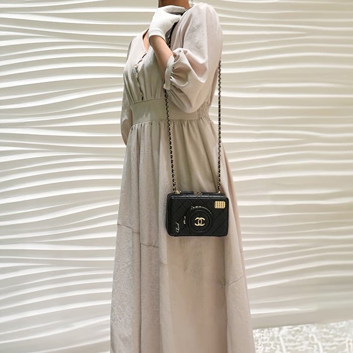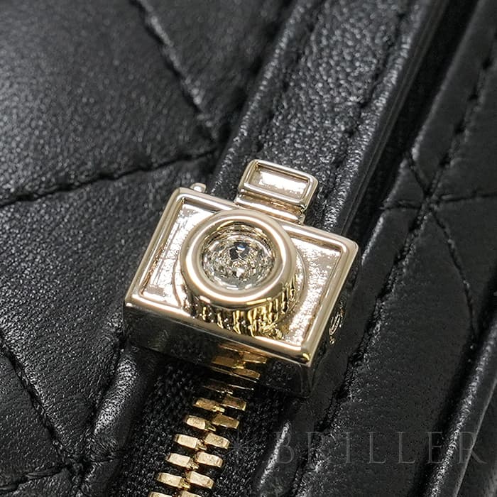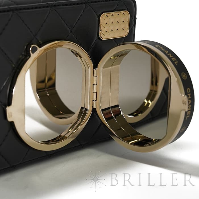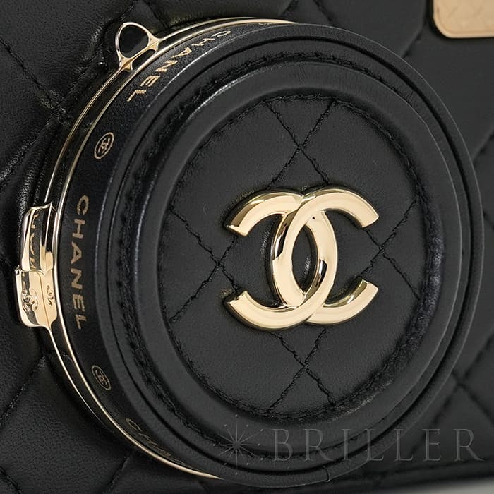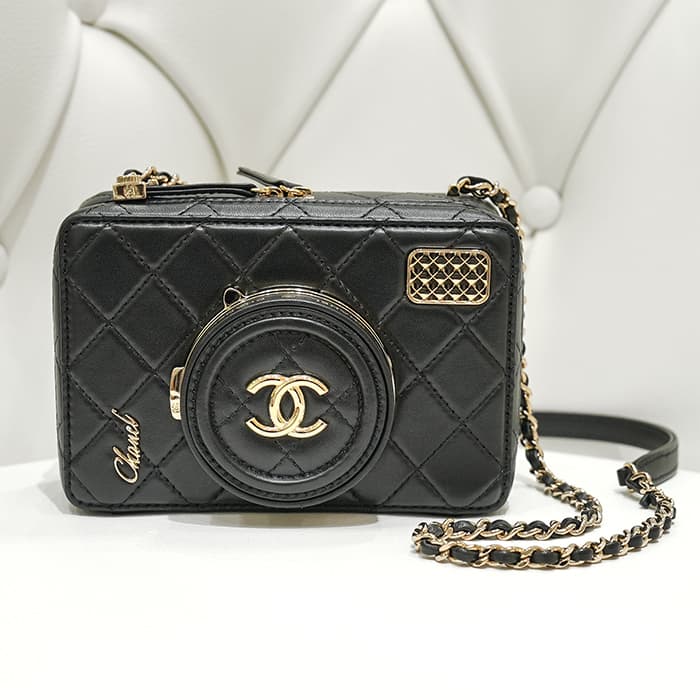 シャネル2024SS新作のカメラをデザインしたショルダーバッグが入荷しました。ココマークが入ったレンズ部分は開くと中にミラーが備え付けられています。また、フラッシュ部分はマトラッセ柄にキラキラ輝くを放ちます。ファスナーの持ち手部分にもカメラがデザインされており、遊び心のあるかわいいバッグです。シックなブラックに滑らかな手触りのラムスキンを使用。型崩れしにくくなる効果があるキルティング加工を施すことで、リッチな質感だけでなく、デイリーユースしやすい実用性をも実現しています。