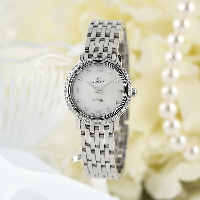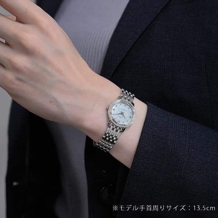 フランス語で「都会」という意味の【デ・ヴィル】。クラシカルでエレガントな時代を超越したデザインで人気のシリーズです。光を反射させる細かいブレスに、見る角度によって色合いの変わる上品なマザーオブパール文字盤とベゼルにダイヤモンドがセッティングされており、ジュエリーのような雰囲気を感じさせます。高性能クォーツムーブメント、Cal.1376を搭載しています。