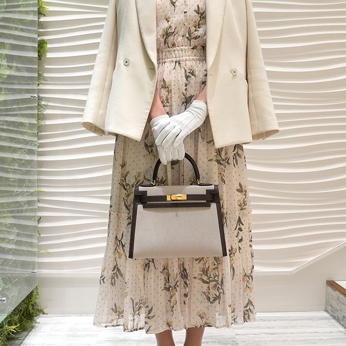 外縫いのケリーならではのフォーマルなフォルムに、キャンバス生地の「トワルアッシュ」と吸い付くような滑らかな触り心地の「ヴォースイフト」を掛け合わせています。ダークブラウンカラーの「モカ」がバッグを縁取るようなデザインになっており、明暗のコントラストでしっかりとした存在感を感じられるデザインです。28サイズはハンドバッグとして軽やかに持ち運ぶことができつつ、ハンドルに腕を通して持つこともできる絶妙なサイズ感。ストラップを付けると肩から掛けることもできるので、装いやシーンに合わせて様々なスタイルでお楽しみいただけます。