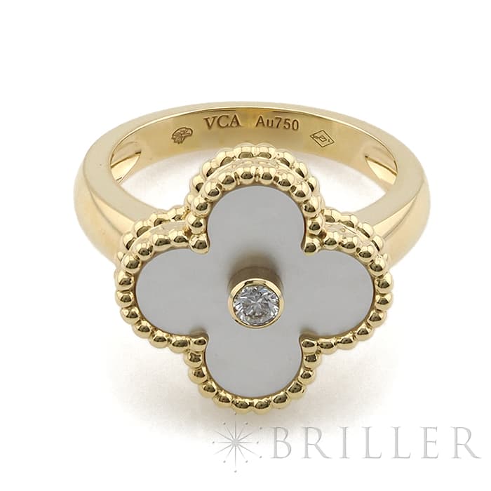 ヴァンクリーフ&アーペルの象徴とも言える「アルハンブラ」コレクション。 ヴィンテージはアルハンブラの4サイズのうち2番目に小さな大きさで、石の種類やデザインが豊富にあります。 こちらは18Kイエローゴールド素材に、ホワイトマザーオブパールとダイヤモンドをあしらったフェミニンな雰囲気のリングです。