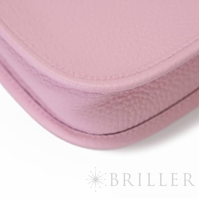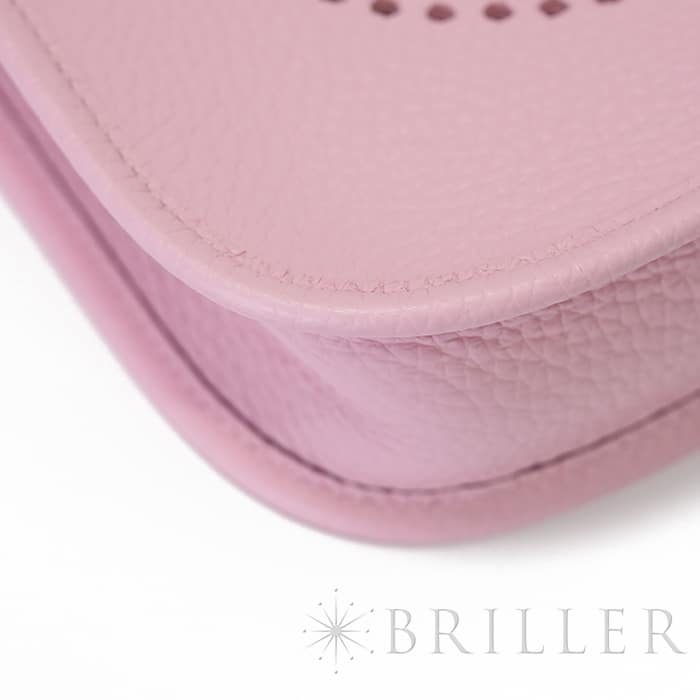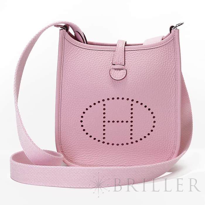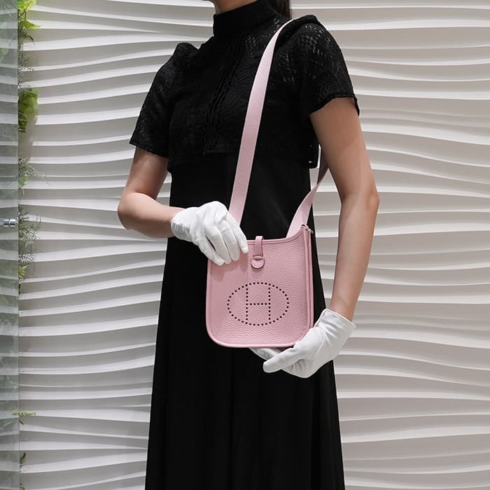 馬の蹄鉄をイメージして作られた「エヴリン」は、カジュアルに普段使いできる人気のショルダーバッグです。 前面にエルメスの頭文字「H」マークを大きくパンチングしたデザインが特徴で、一目でエルメスのバッグを分かります。TPMはコンパクトなサイズ感で、おでかけの必需アイテムであるミニ財布やキーケース、コンパクトなどは難なく収納することができます。肩掛けにも斜め掛けにもでき、その日の気分やファッションによって変えてお楽しみいただけます。ピンクの魅力をぎゅっと凝縮したような淡い桜のカラーは、フェミニンなファッションが好きな方にぴったりです。ピンクが苦手な方も、ツイリーやチャームを付けてあげると、使いやすくなります。