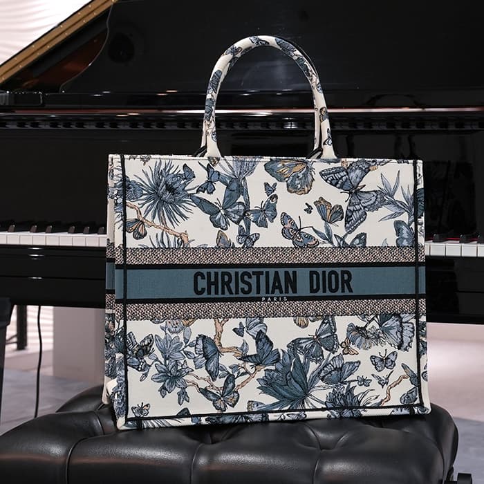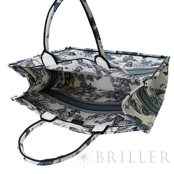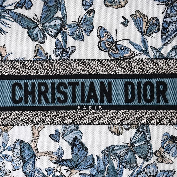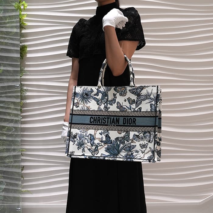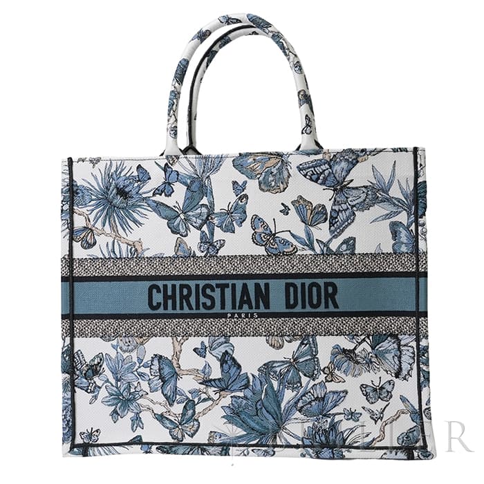 フランスのファッションデザイナー クリスチャン・ディオールが1946年パリで創立したファッションブランドを展開するクリスチャン・ディオール。ディオールのデザイナー、マリア・グラツィア・キウリが書店のトートバッグから着想を得て作成されたディオール新定番「ブックトート バッグ」。素材はエンブロイダリーキャンバスでパステルミッドナイトブルーの「トワル ドゥ ジュイ メキシコ」モチーフが全面に刺繍されており、中央にはChristian Dior Parisシグネチャーがデザインされています。ミニ、スモール、ミディアム、ラージの4つのサイズ展開がされており、ラージは一番大きいサイズで、手持ちのほか、肩掛けでもお使いいただけます。お財布やメイクポーチ、日傘をいれても余裕のあるたっぷりとしたサイズ感で、1泊2日のご旅行バッグとしても十分な収納力です。
